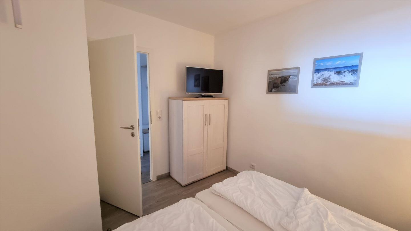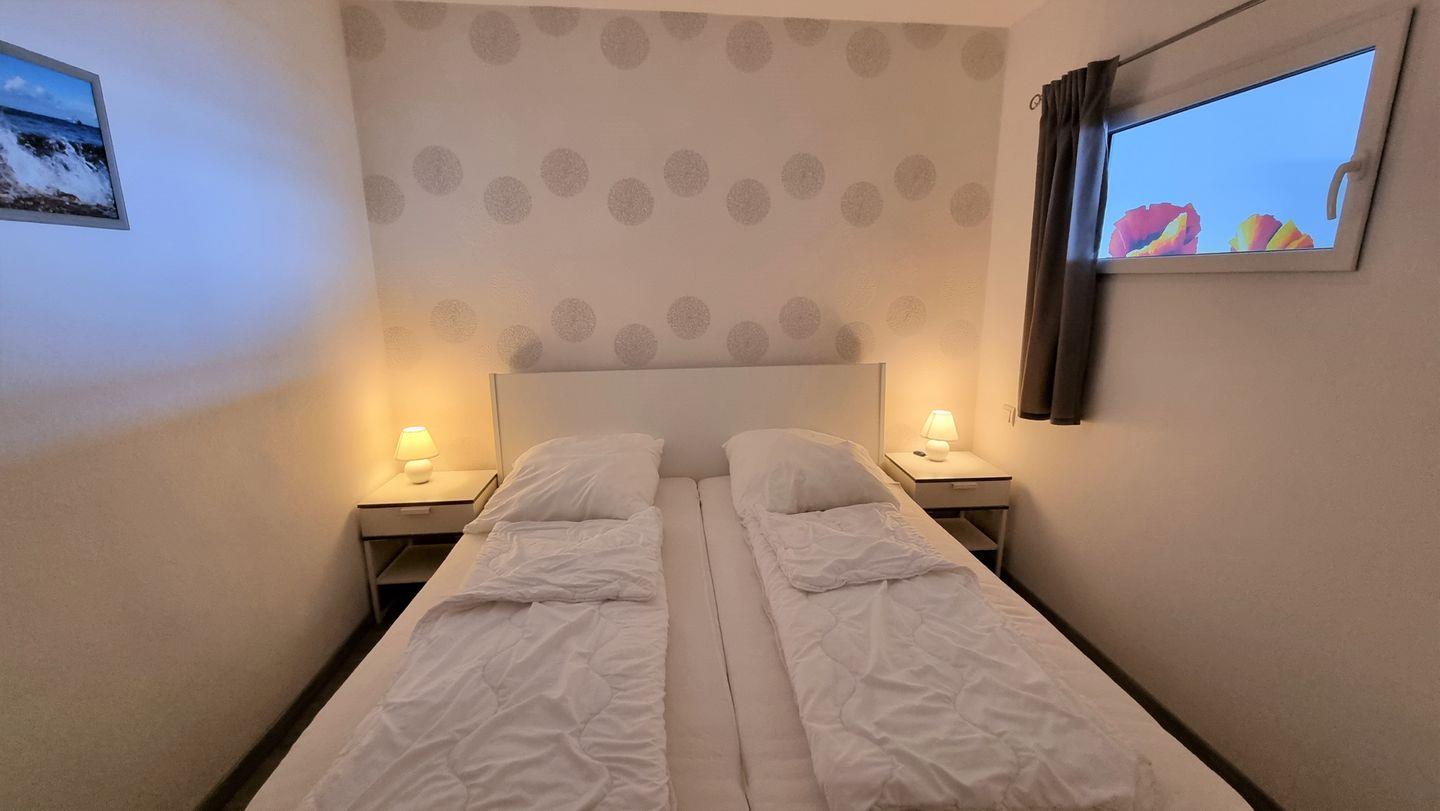 Das vom Wohnraum getrennte, Schlafzimmer, ist vom Flur aus begehbar, hat ein eigenes Fenster zum Wohnzimmer und verfügt über ein Doppelbett (je 90 *200), 2 Nachttische, ein Sideboard sowie einen weiteren 32 Zoll Flachbild-TV.