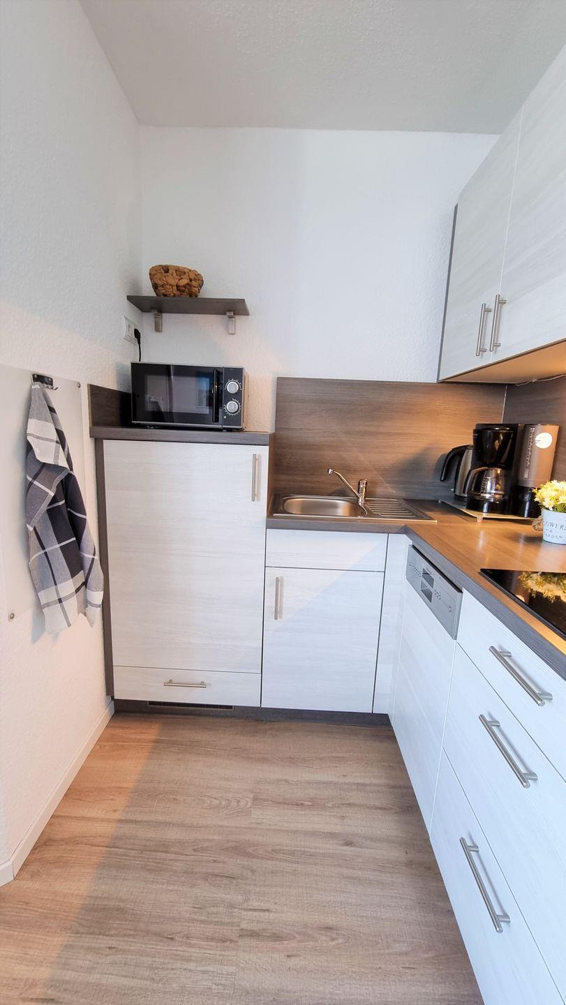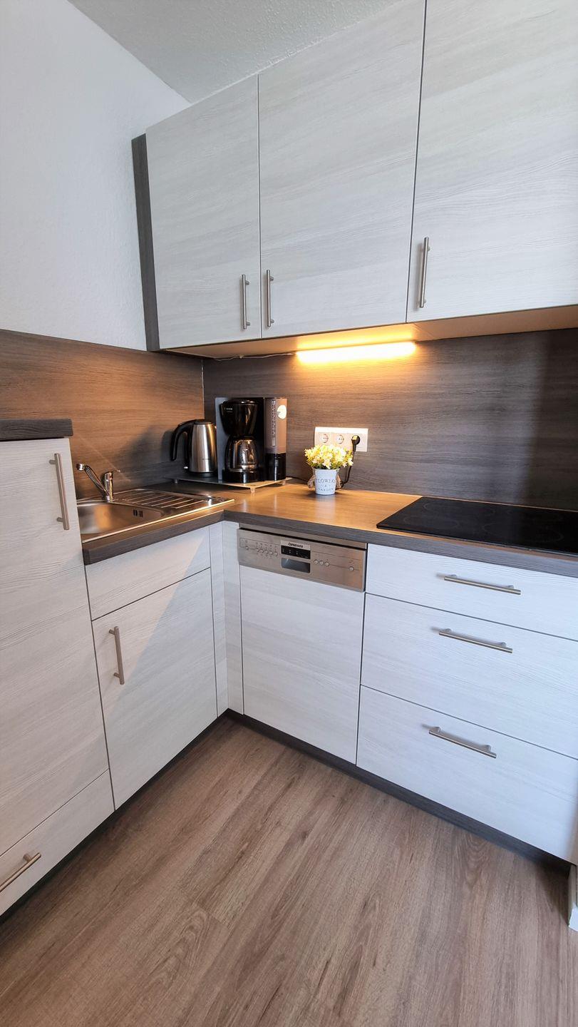 Die, offene, neue Küche ist komplett ausgestattet: 4er Ceranfeld, Kühlschrank mit Gefrierfach, Geschirrspüler, Mikrowelle, Kaffeemaschine, Wasserkocher, Eierkocher, Toaster, Kaffeemaschine sowie einer Tassimo-Kaffeemaschine.