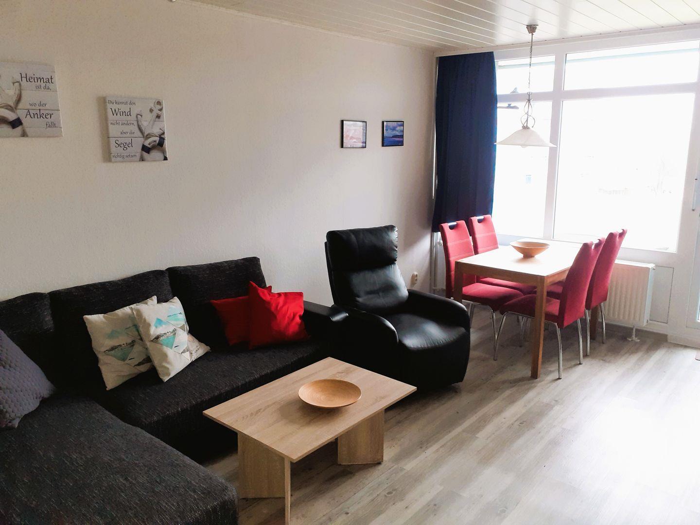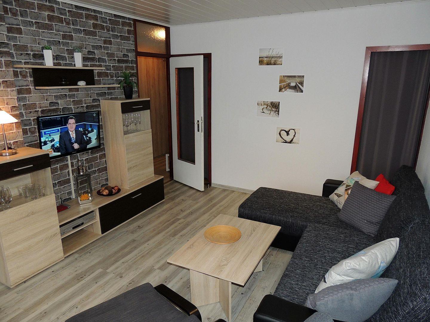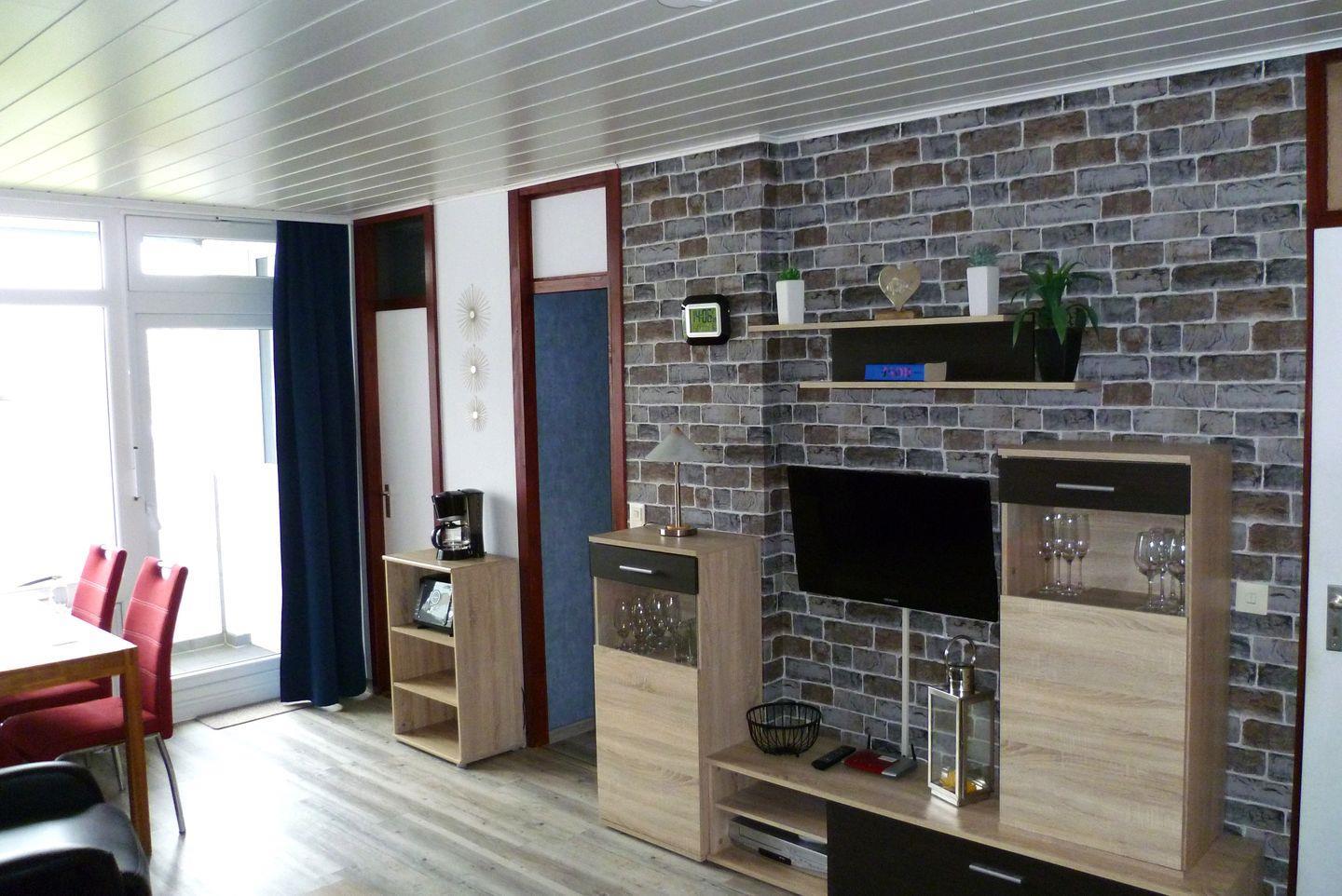 Die Ferienwohnung befindet sich im 2. Stock des Ferienparks und ist bequem mit einem Aufzug erreichbar. Sie erwartet ein gemütliches Wohnzimmer, das mit einer Couch, einem Sessel und einem TV mit Satellitenanschluss eingerichtet ist. Hier können Sie entspannte Abende verbringen und Ihre Lieblingssendungen oder Filme genießen. Der Essbereich ist perfekt für gesellige Mahlzeiten und lädt zum gemeinsamen Kochen in der gut ausgestatteten Kochnische ein, die mit einer Mikrowelle, einem 4-Platten-Herd, einem Kühlschrank sowie weiteren Küchenutensilien ausgestattet ist.