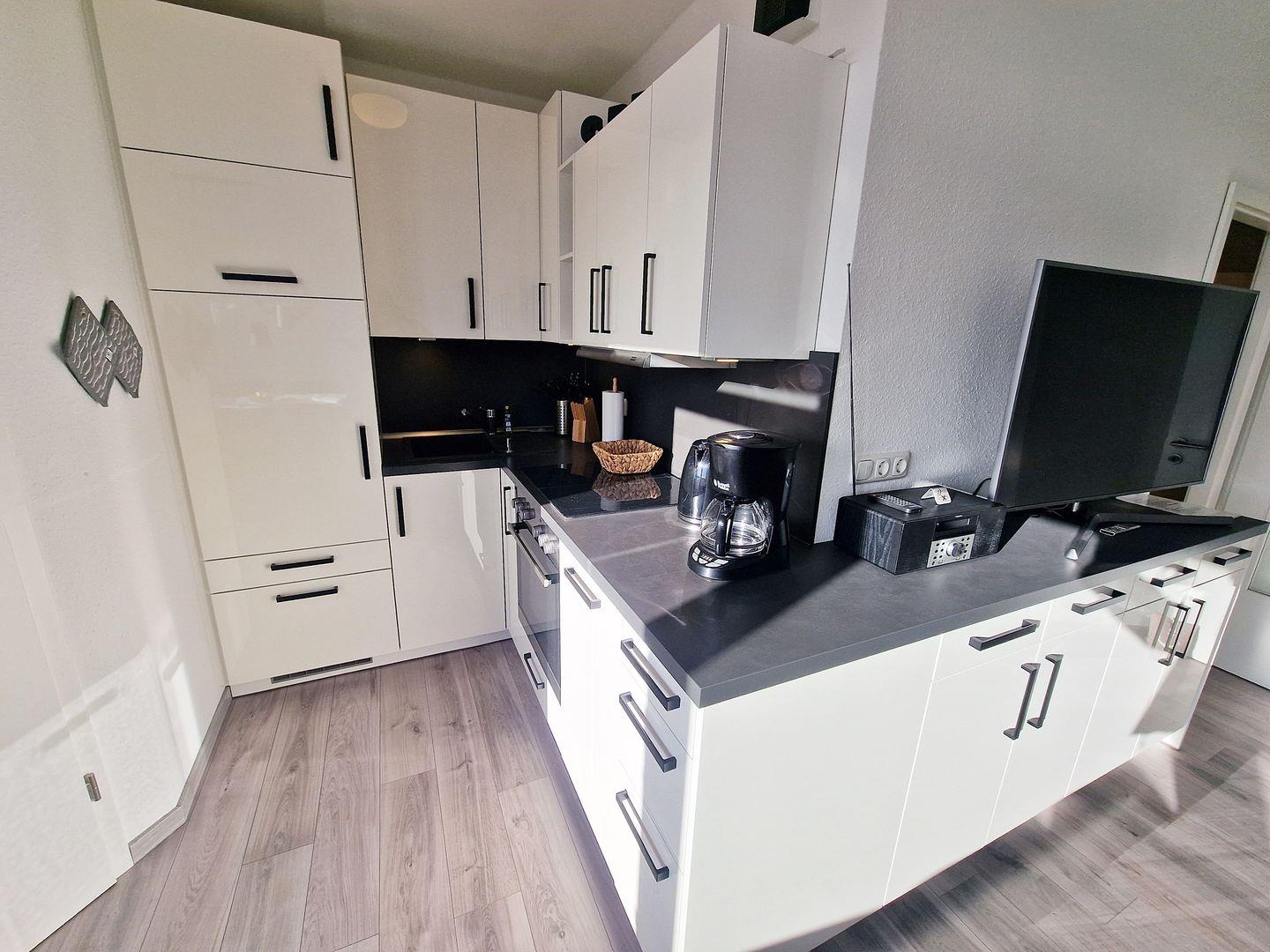 Die Einbauküche ist mit Kühlschrank (inkl. Gefrierfach) Herd mit Ceranfeld, Geschirrspüler, Mikrowelle, Wasserkocher, Kaffeemaschine und Toaster ausgestattet.