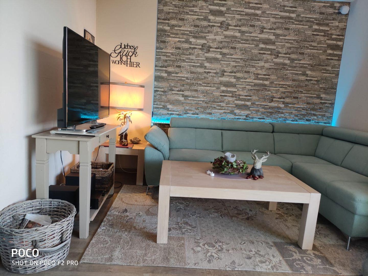 Das gemütliche Wohnzimmer ist mit einer Couch in L-Form und einem Essbereich ausgestattet.