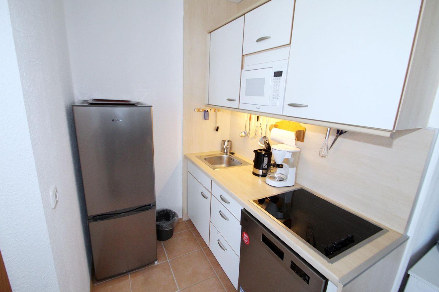 Die Küche ist hell und mit Mikrowelle, Geschirrspüler und Cerankochfeld hervorragend zum selberkochen geeignet.