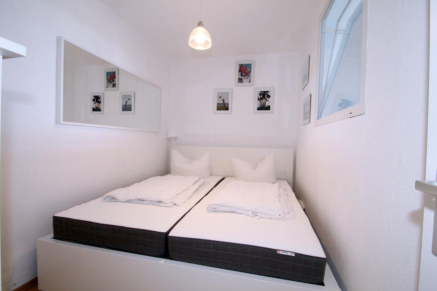 Das Elternschlafzimmer ist mit einem Doppelbett (100x200cm) ausgestattet und mit einem Zugang vom Flur aus versehen- ein großes Fenster bringt natürliches Licht in den Raum.
