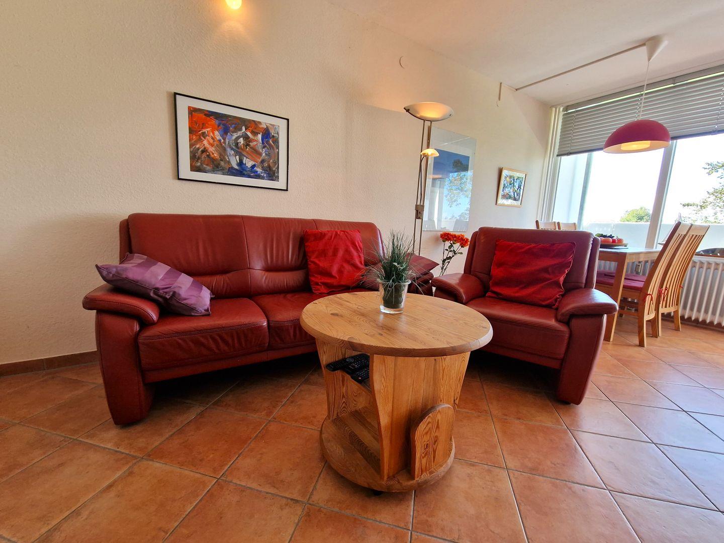 Der helle und moderne, harmonische Wohnbereich ist terrafarben gefliest und mit einer 3er Ledercouch sowie einem Sessel, 80cm LCD-TV (Smart-TV), HiFi-Anlage und BluRay-Player ausgestattet.