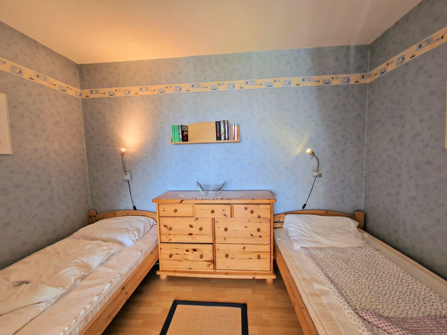 Im Kinderzimmer finden bis zu drei Personen Platz; hier steht ein Etagen (90 x 200) - und ein Einzelbett (90 x 180), jeweils aus Holz.