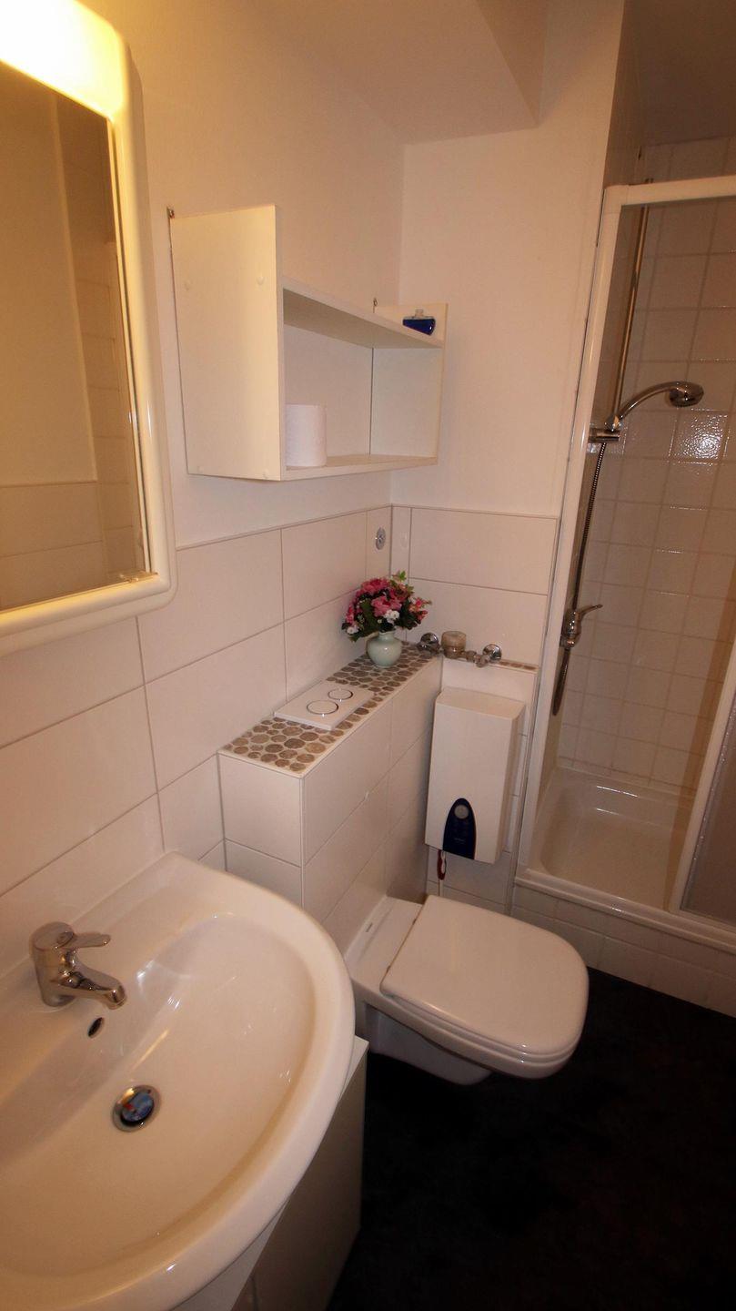 Das Badezimmer verfügt über ein Hänge-WC sowie eine Duschkabine.