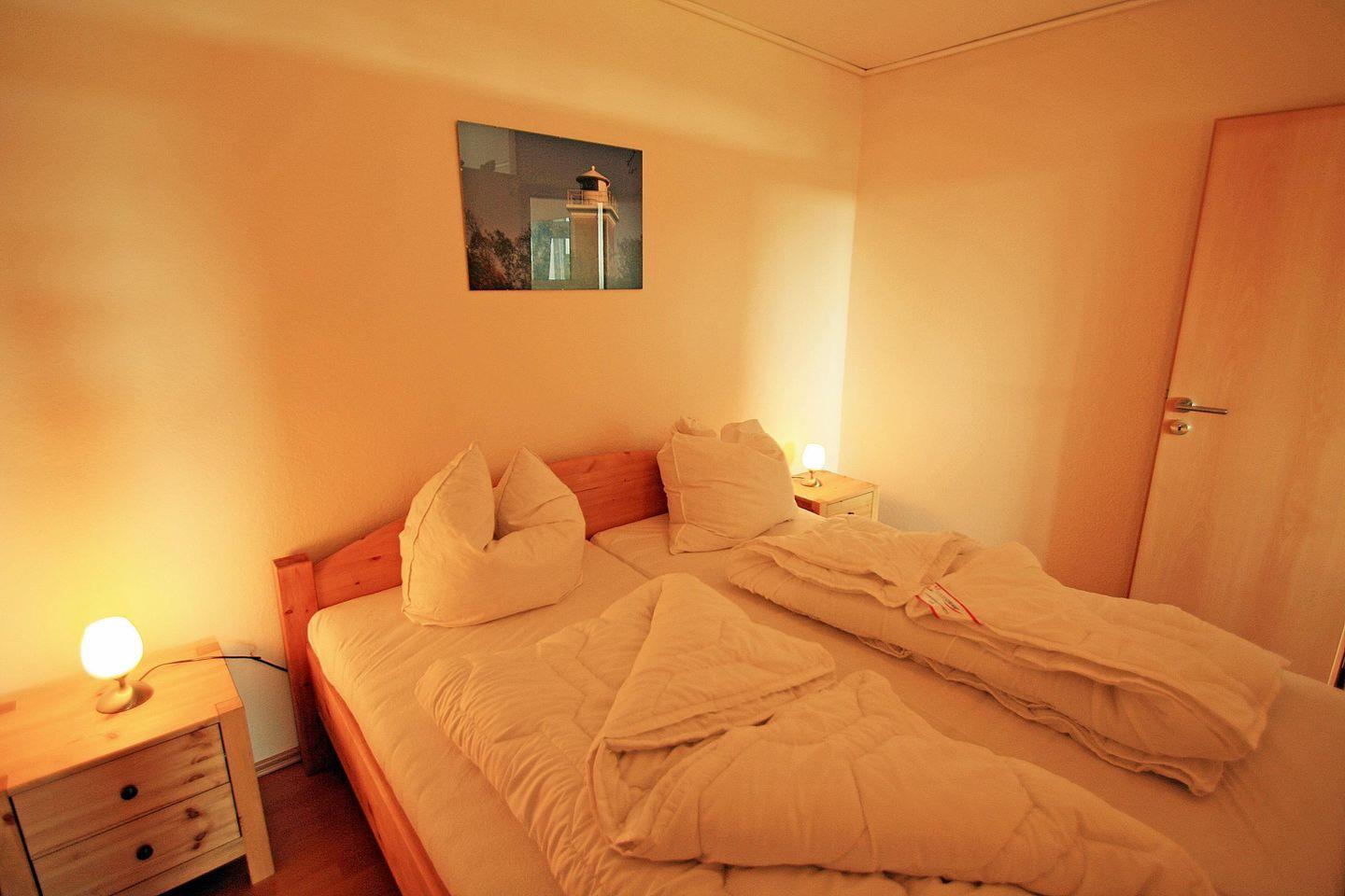Der Schlafbereich mit Doppelbett ist durch eine Wand und zwei Türen vom Wohnbereich abgetrennt.