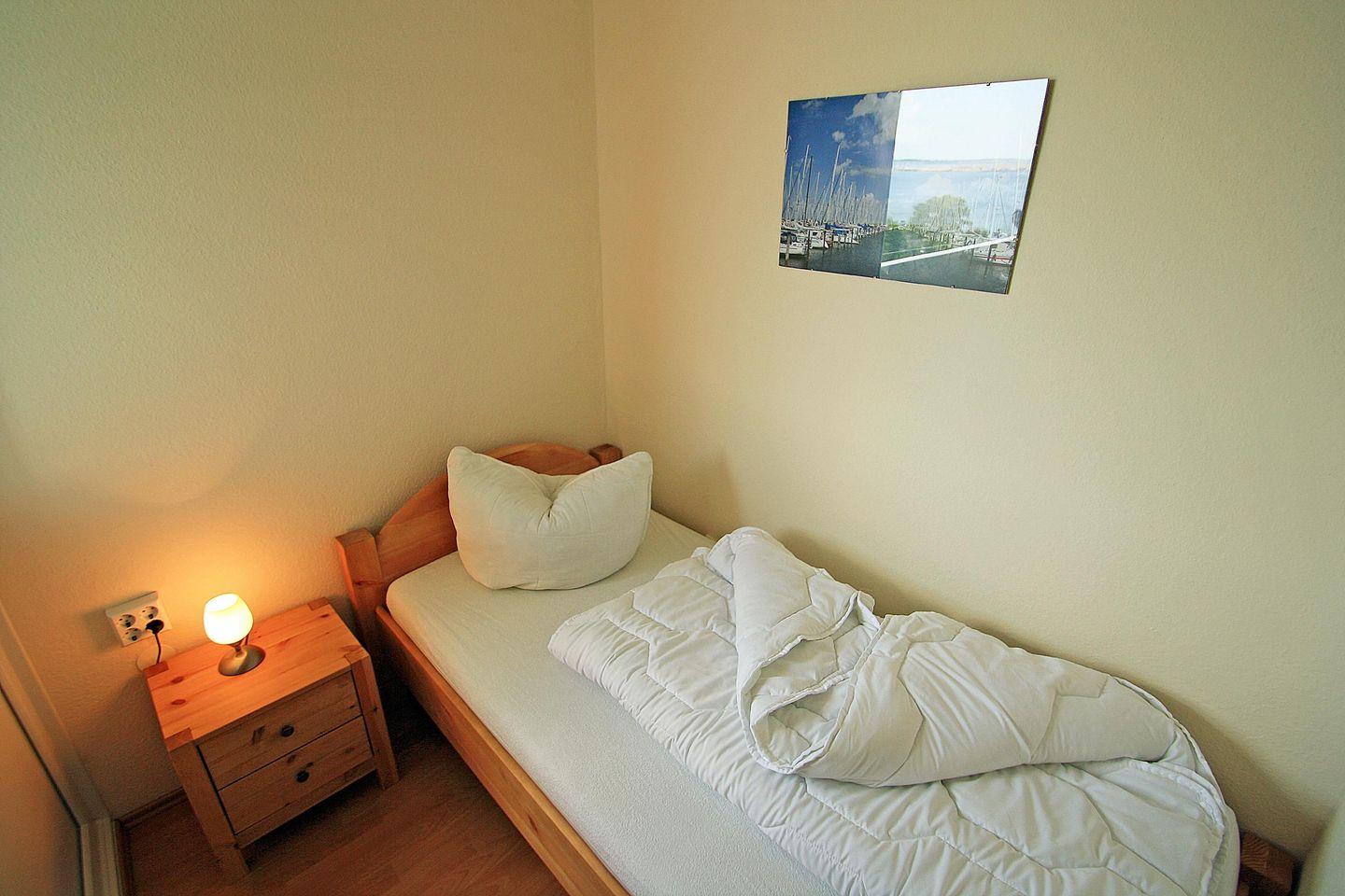 Das Kinderzimmer ist mit Einzelbett und Nachttisch ausgestattet und durch eine Tür erreichbar.