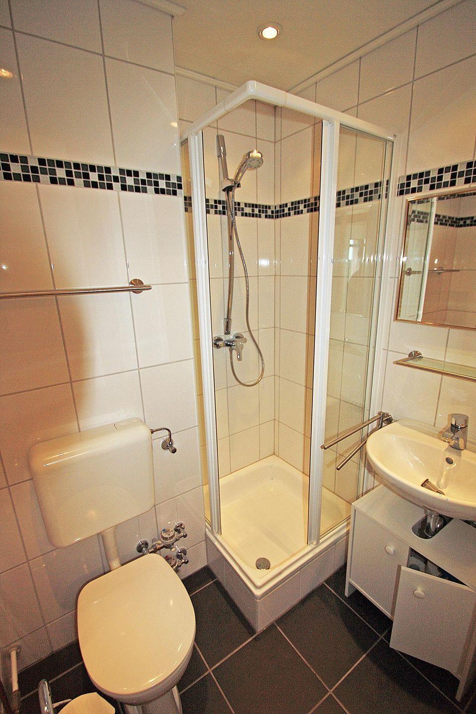 Im neuen Bad befindet sich eine Duschkabine und ein Spiegelschrank.