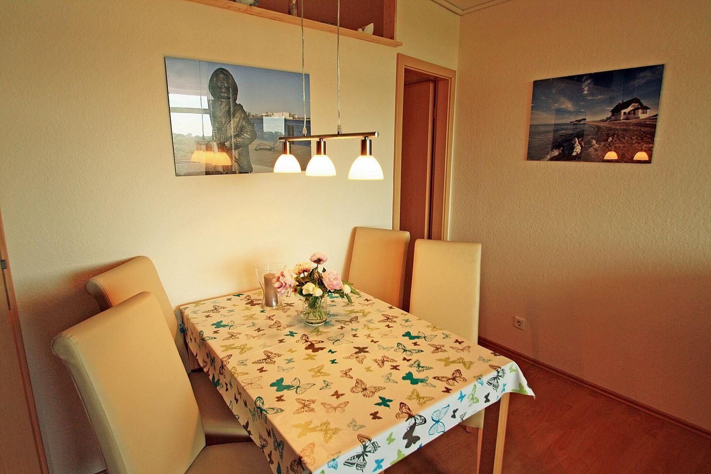 Ein LCD-TV und eine Musikanlage sorgen für Unterhaltung. Der Esstisch befindet sich im hinteren Bereich und bietet Platz für 4 Personen.