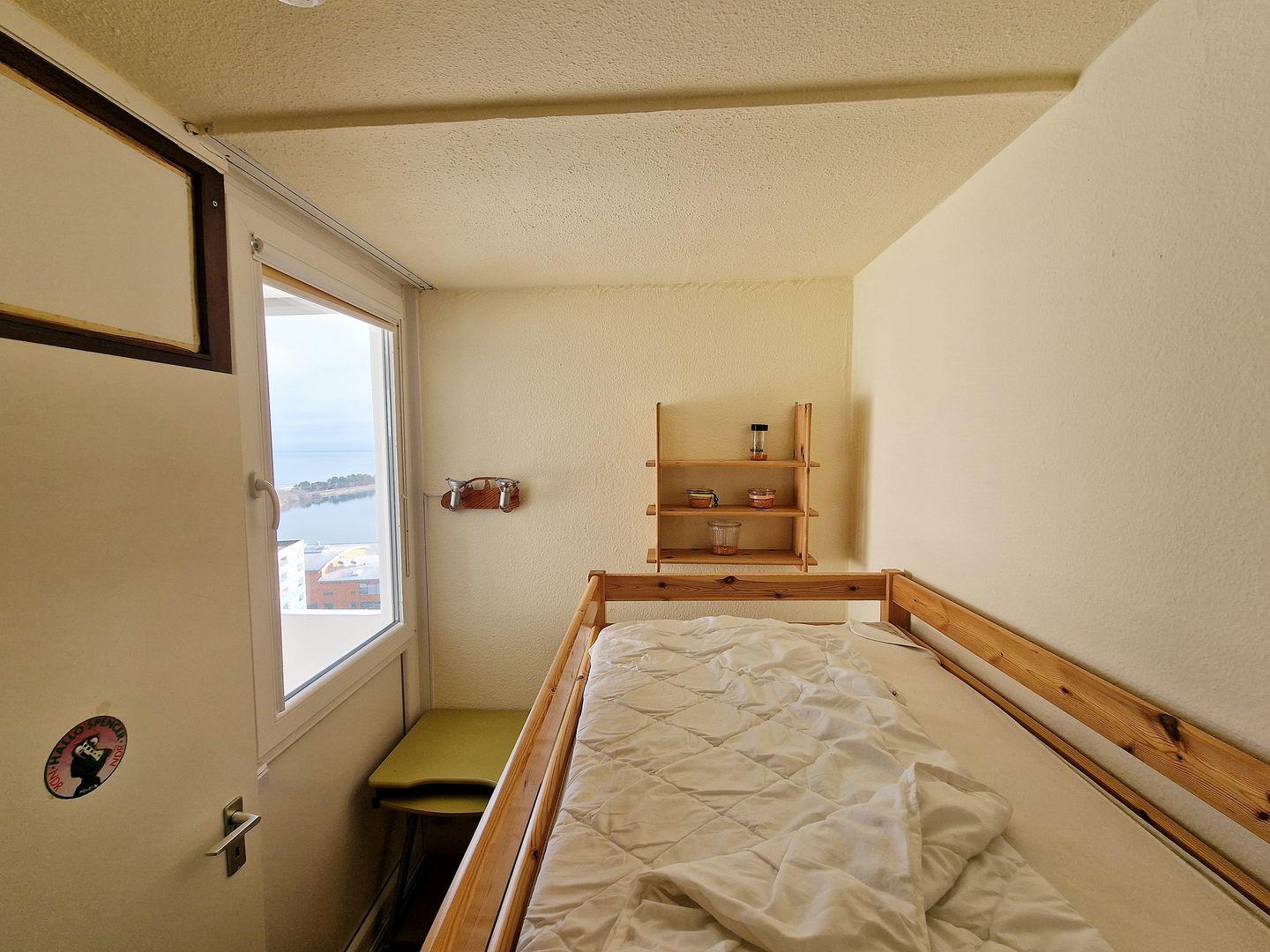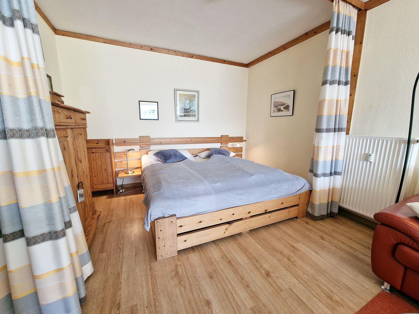 Schlafbereich mit einem Doppelbett und durch Vorhang zum Wohnbereich getrennt.