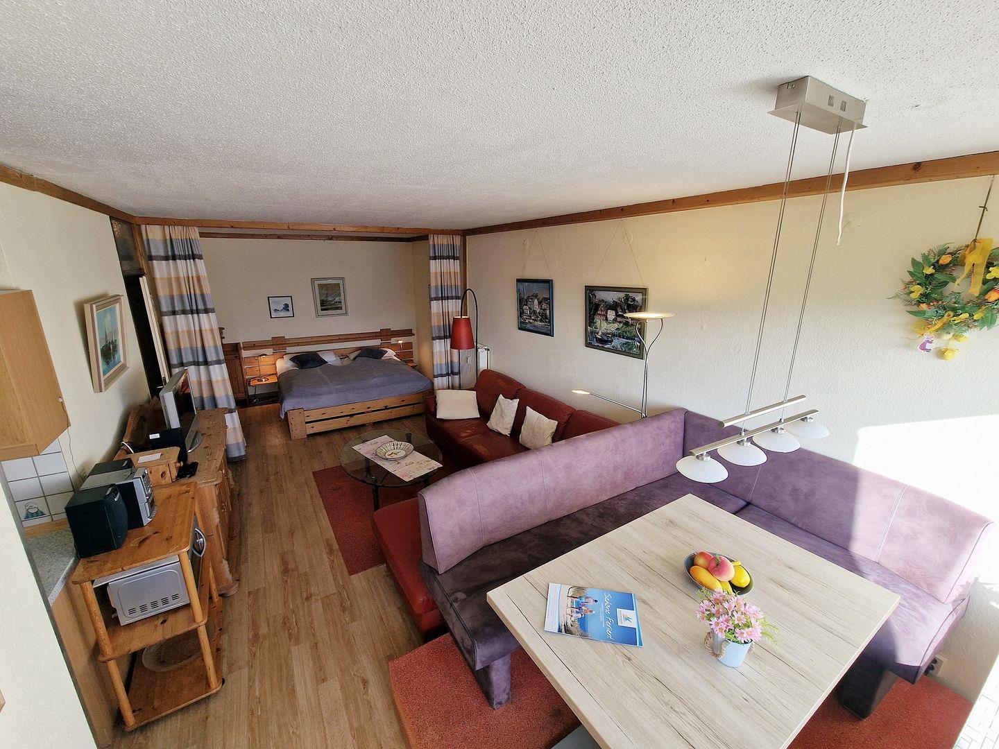 Direkt am Fenster befindet sich auf einem Podest eine moderne Eckgarnitur als Essecke mit tollem Ausblick.