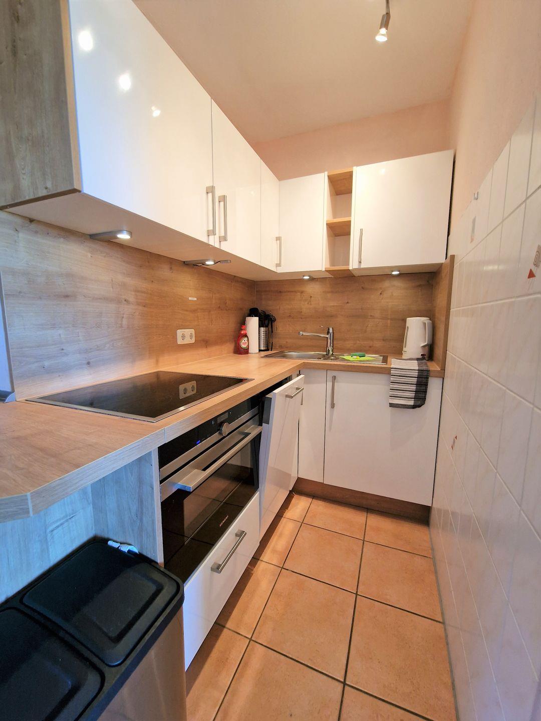 Offene Küche mit 4er-Ceranfeld, Backofen, Mikrowelle, Kaffeemaschine und Kühlschrank mit Gefrierfach.