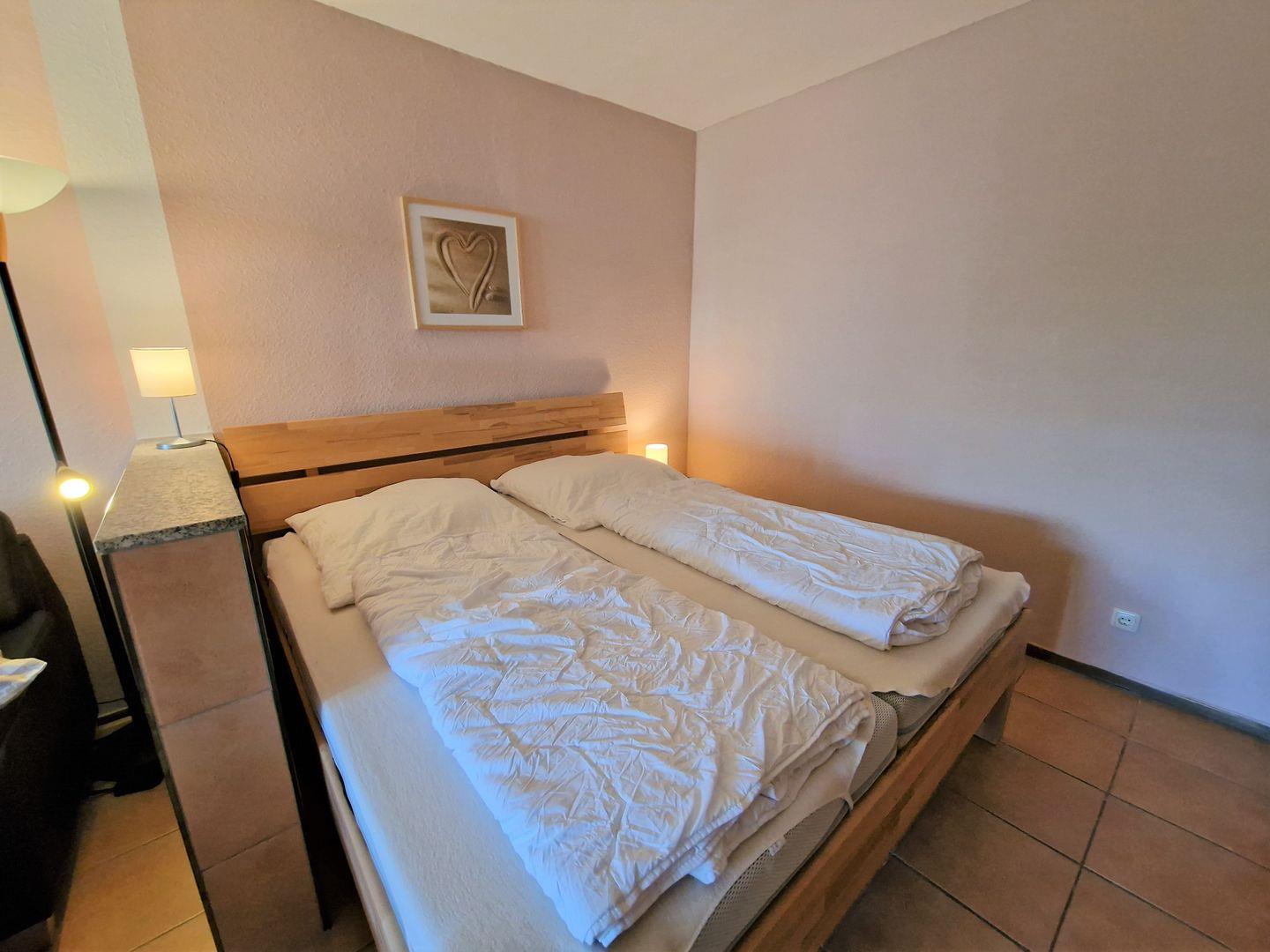 Schlafbereich mit einem großen Doppelbett und durch eine kleine Mauer stilvoll vom Wohnraum abgetrennt.