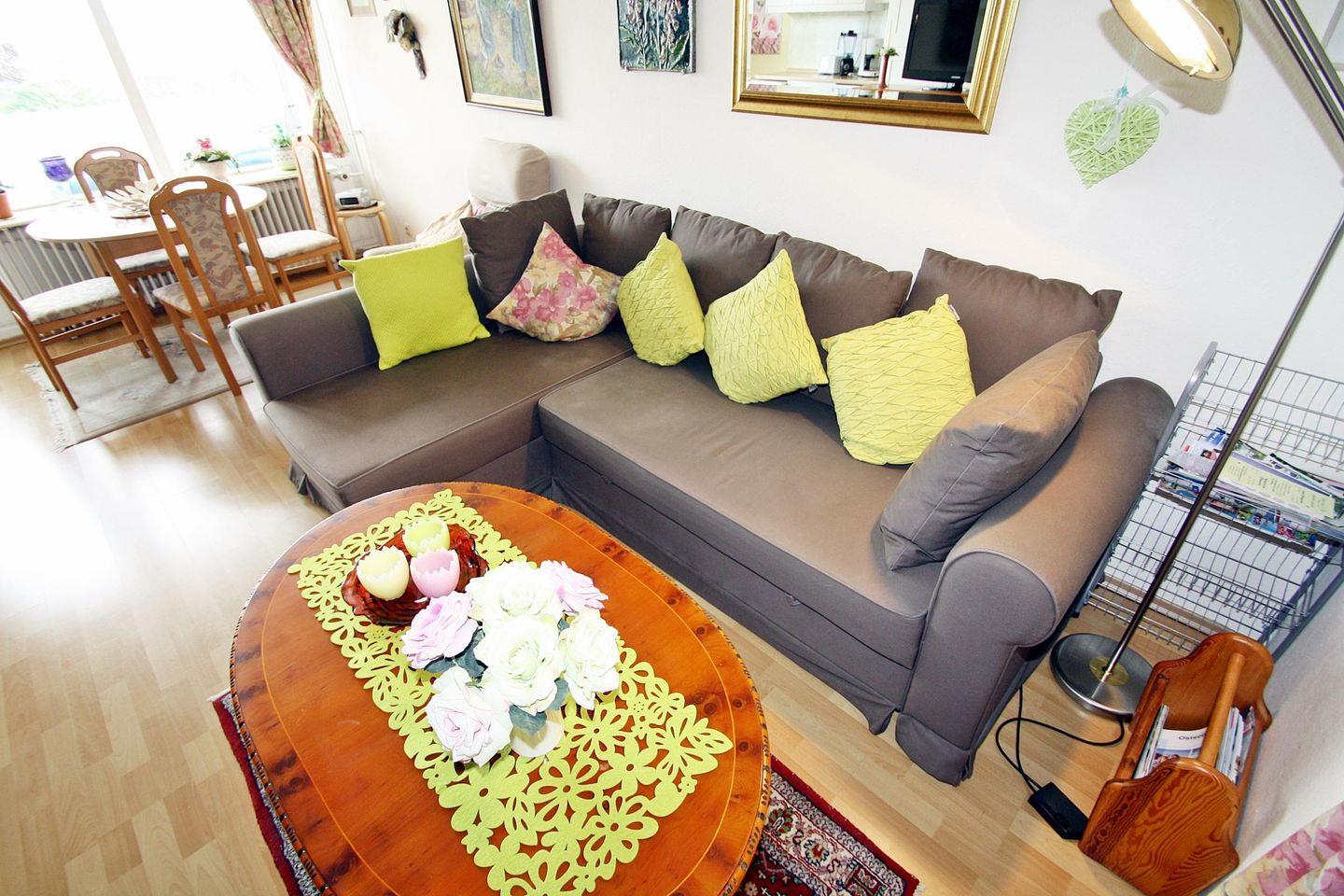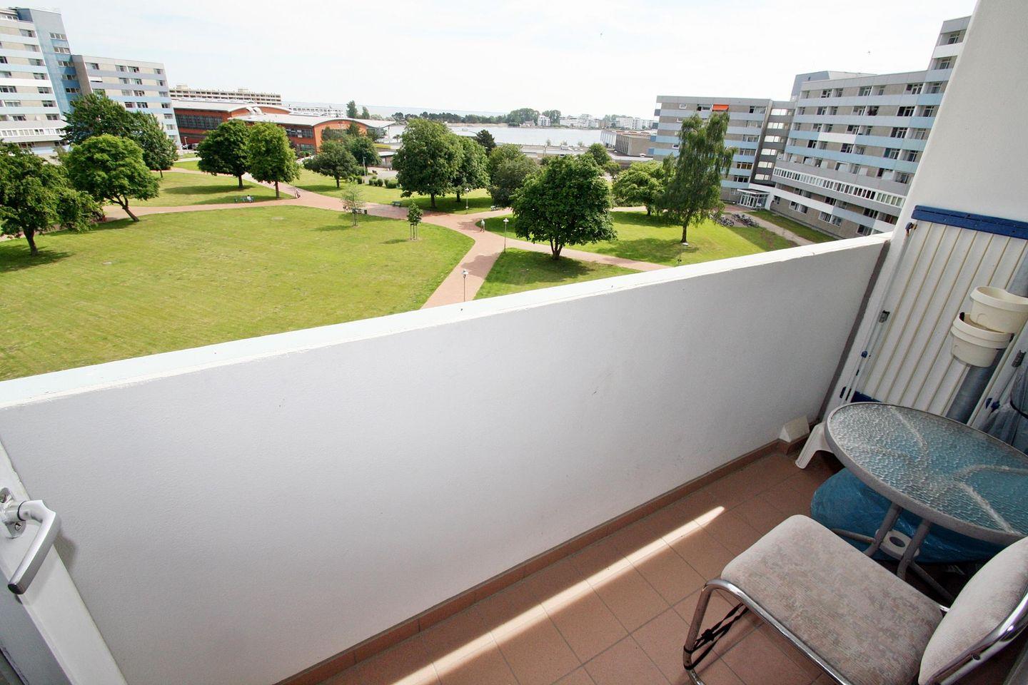 Gemütliche und gepflegte Wohnung mit Balkon für 4 Personen (Schlafcouch für 2 im Wohnbereich). Blick über die Innenhof-Parkanlage in Richtung Ostsee.