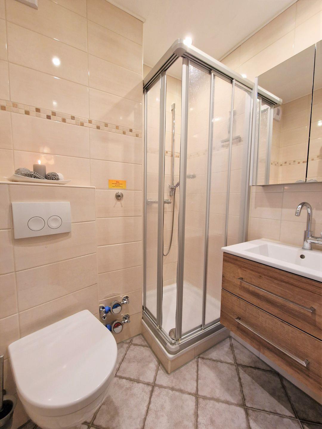 Das Badezimmer bietet eine Dusche mit Wanne, ein Waschbecken, ein WC sowie einen Spiegelschrank und Waschbeckenunterschrank. Für zusätzlichen Komfort sorgt die zentrale Heizung, die dafür sorgt, dass Sie sich auch an kühleren Tagen wohlfühlen.