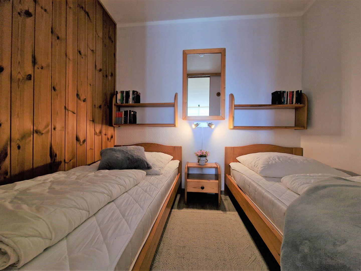Die Ferienwohnung verfügt über ein Schlafzimmer (durch eine Schiebetür vom Wohnbereich getrennt) mit komfortablem Laminatboden und 2 Einzelbetten mit Nachtschränken, in dem eine erholsame Nachtruhe garantiert ist.