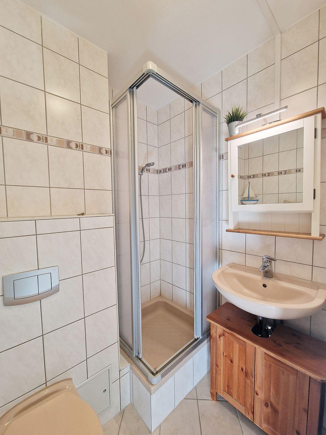 Modern renoviertes Bad in hellem beige gehalten mit einer Duschkabine.