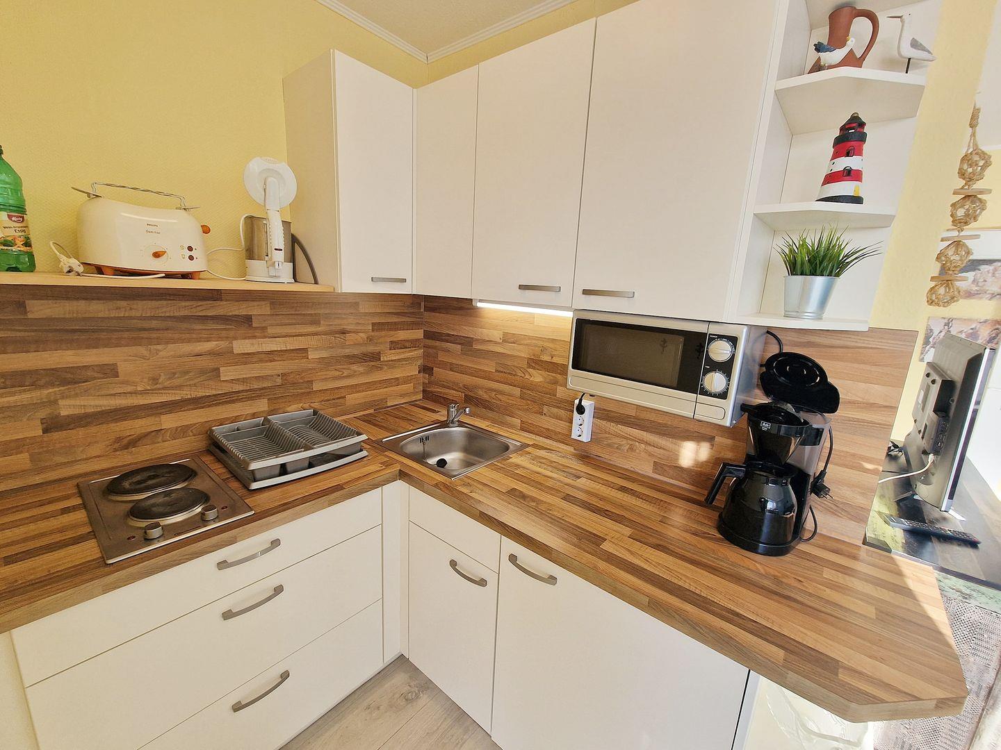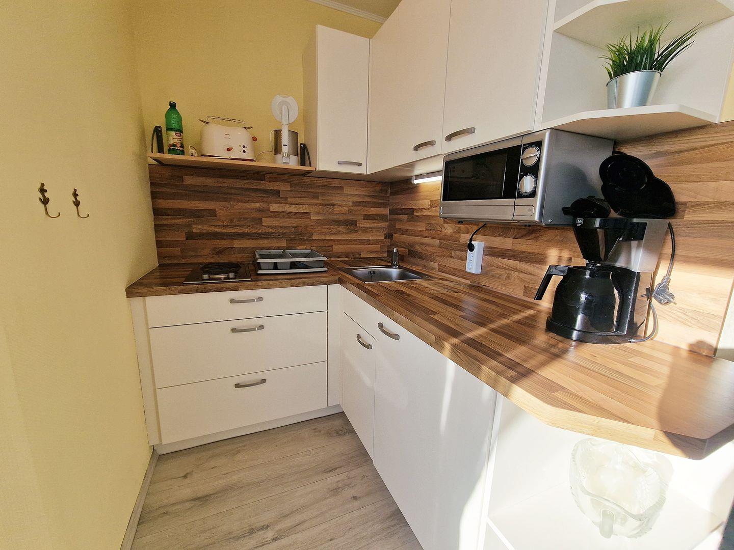Die Küche ist mit 3-Plattenherd, Mikrowelle und Kühlschrank mit 3*Gefrierfach ausgestattet.