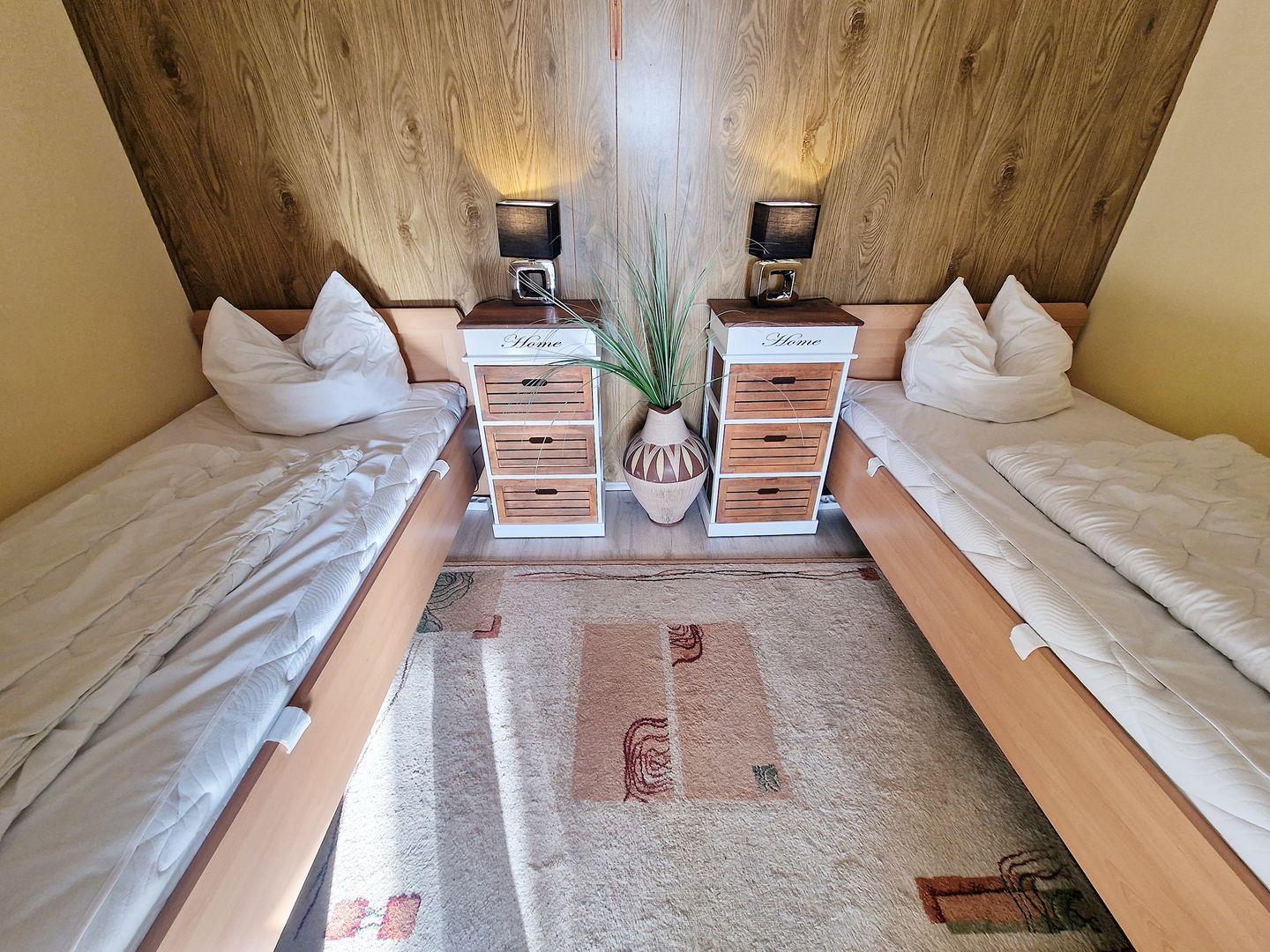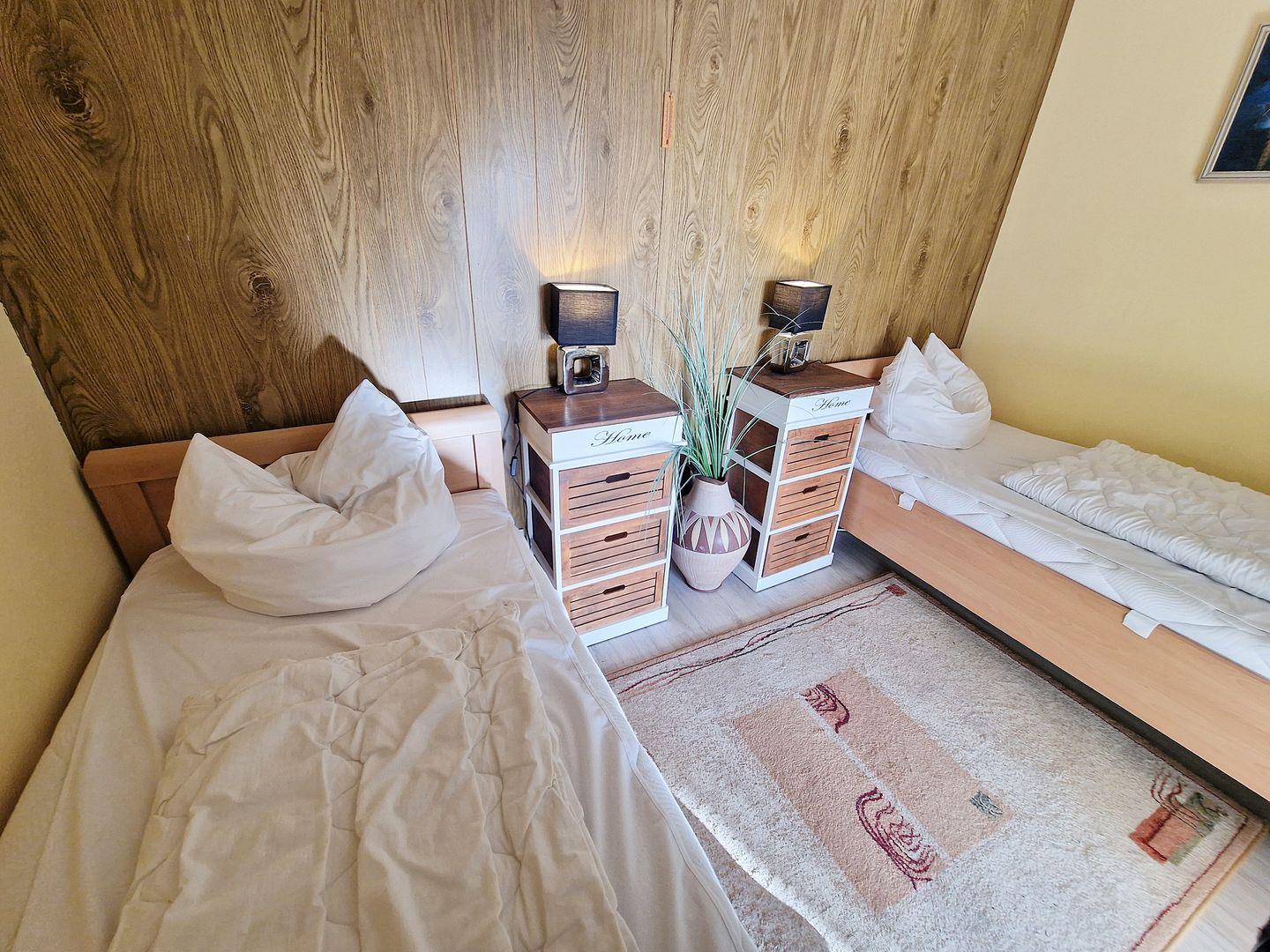 Im Schlafbereich stehen 2 Einzelbetten 90*200 cm und eine Kommode.