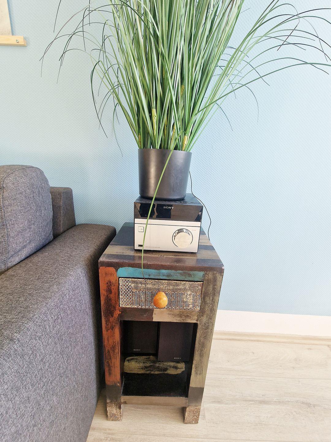 Im Wohnzimmer stehen ein gemustertes Schlafsofa für 2, eine große Kommode sowie eine Vitrine aus Glas.