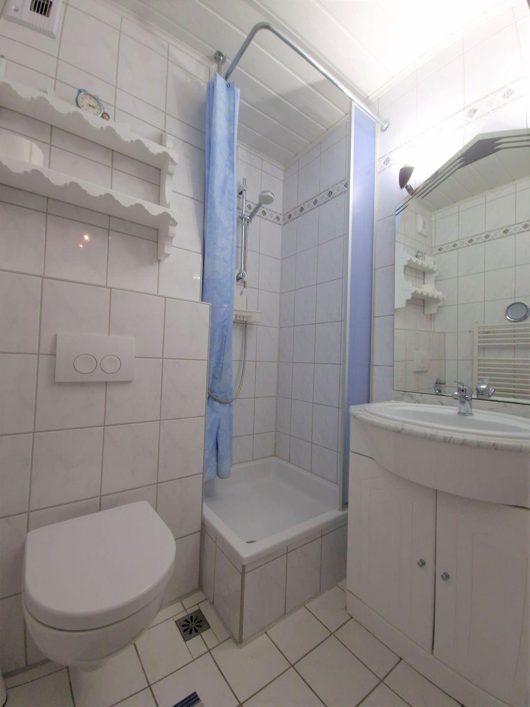 Dieses ist gefliest, hell eingerichtet und verfügt über ein WC sowie eine Dusche (mit Vorhang und kleiner Seitenwand, hoher Einstieg).