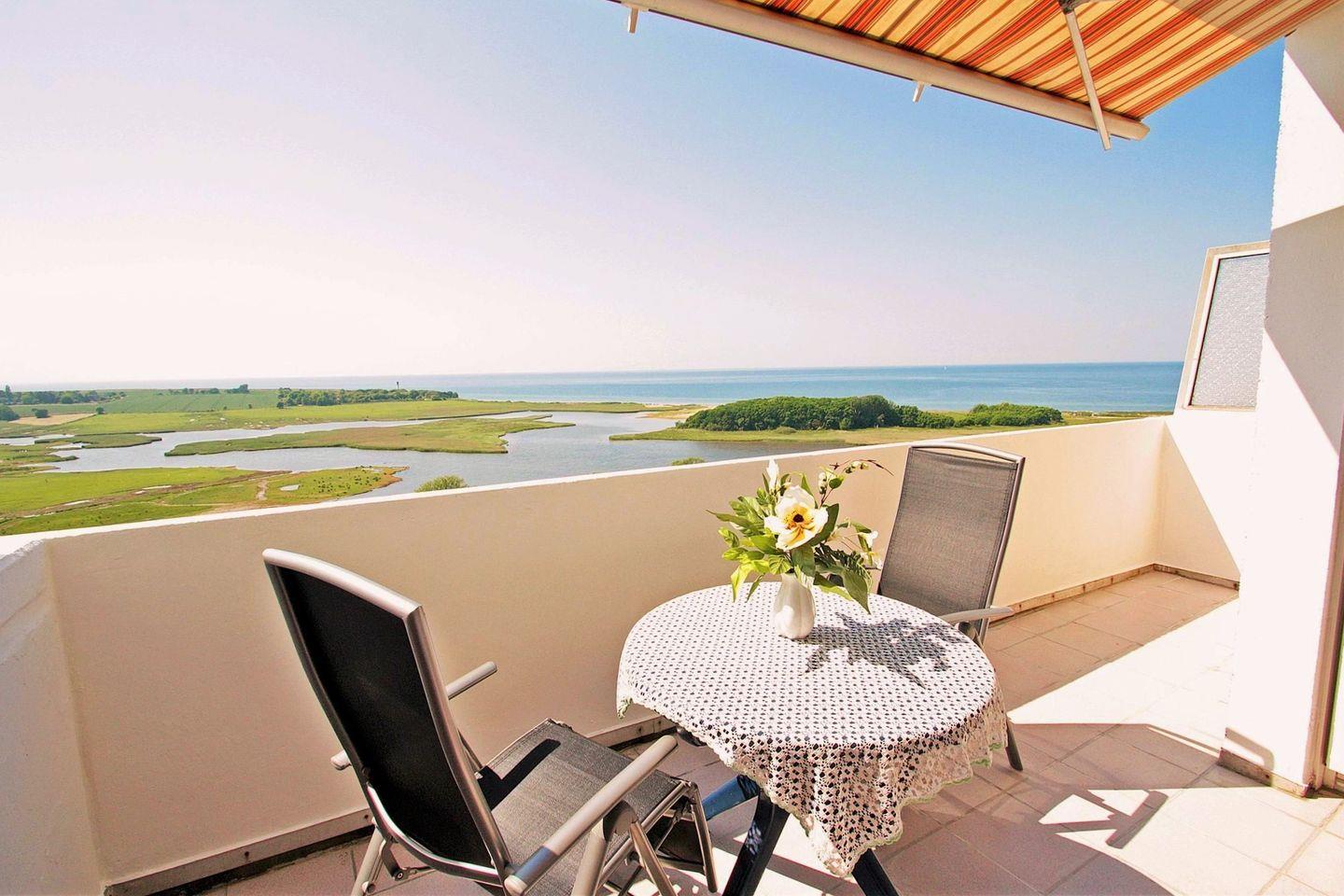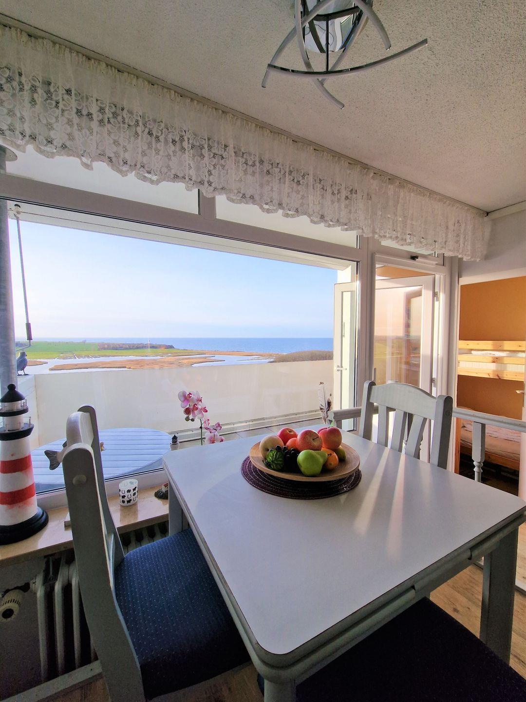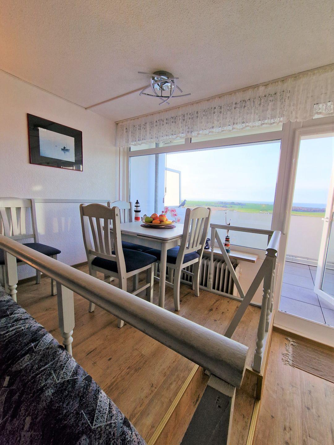 Die Essecke, im Wohnbereich, befindet sich direkt am Fenster auf einer Anhöhe/Podest, von wo Sie den herrlichen Blick über die Ostsee Richtung Leuchtturm genießen können.