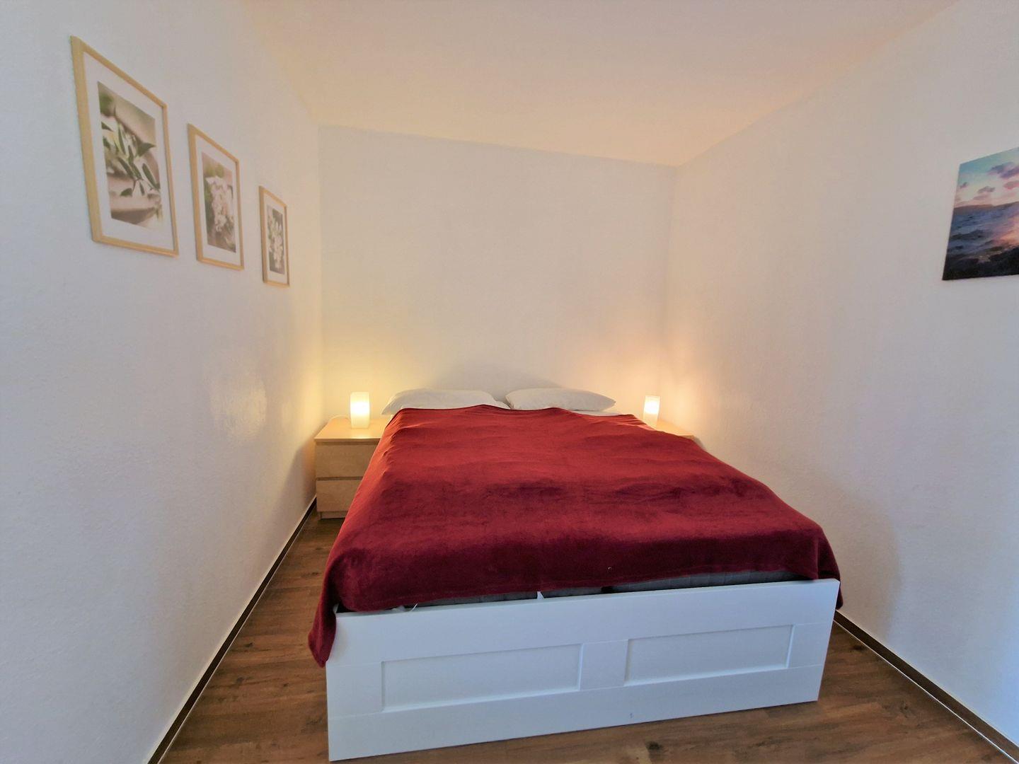 Wenn Sie danach gleich rechts abbiegen, erwartet Sie der Schlafbereich für die Erwachsenen (offen, ohne Vorhang und Tür). Das gemütliche Doppelbett (2 x 90*200) wird Ihnen erholsame Nächte bescheren. Am Morgen können Sie vom Bett aus schon die ersten Nachrichten schauen. Der Flachbildschirm (80 cm Durchmesser) sorgt dafür.