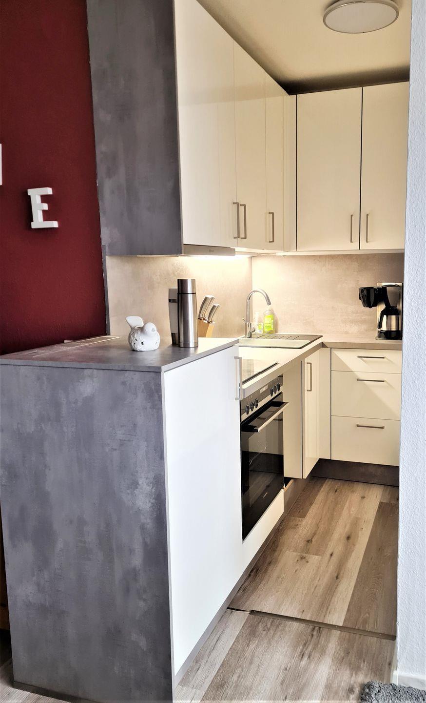 Die helle Küche verfügt über ein Cerankochfeld, einen Backofen, eine Kühl-Gefrier-Kombination und eine Geschirrspülmaschine.