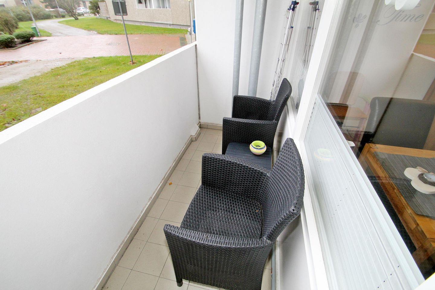 Der hell geflieste Balkon ist mit einer Sitzgarnitur ausgestattet.