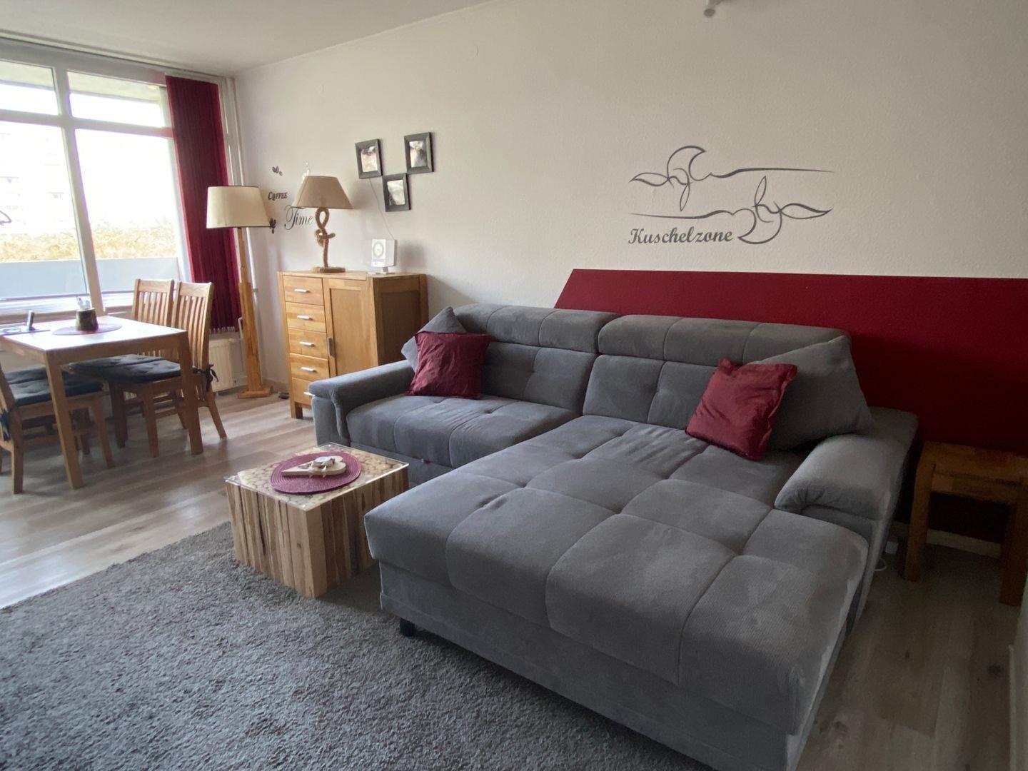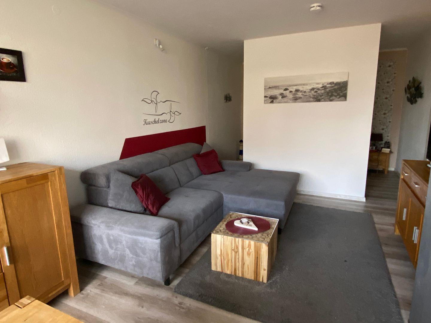 Im Wohnzimmer befindet sich eine dunkle Stoffcouch in L-Form mit einem robustem Holztisch, gegenüber steht eine Anrichte mit einem großen Flachbildfernseher.
