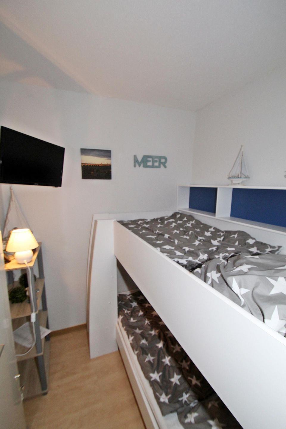 Im Kinderzimmer befindet sich ein Etagenbett und ebenfalls ein kleiner Flachbildfernseher.