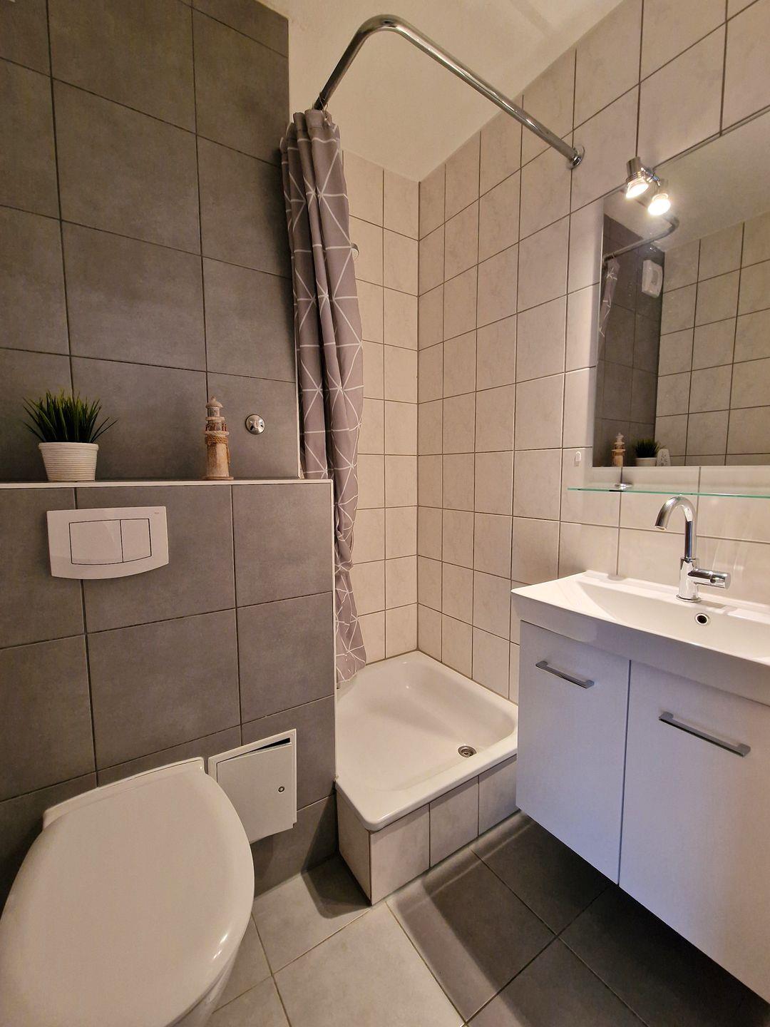 Das Badezimmer ist im weiß/gräulichem Flair gestaltet und verfügt über ein WC/Waschbecken und eine Dusche (hoher Einstieg) mit Duschvorhang. Das Badezimmer ist gefliest.