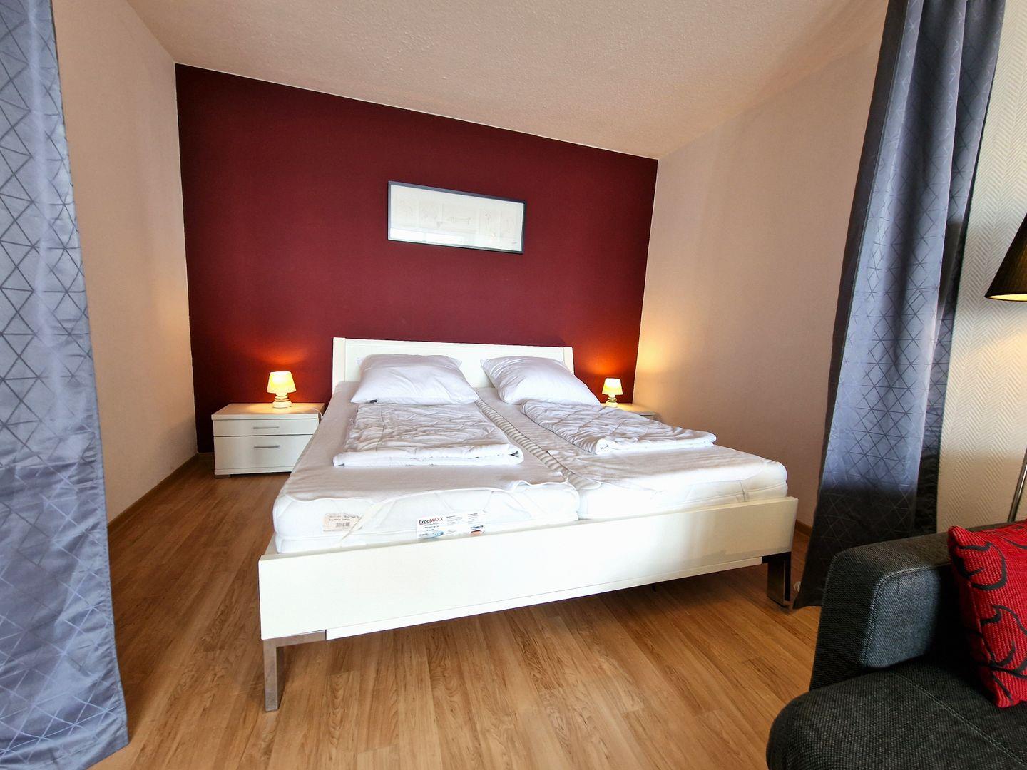 Abgetrennt vom Wohnbereich können Sie in das gemütliche Bett (2 90*200) fallen. Getrennt mit einem Verdunklungsvorhang.