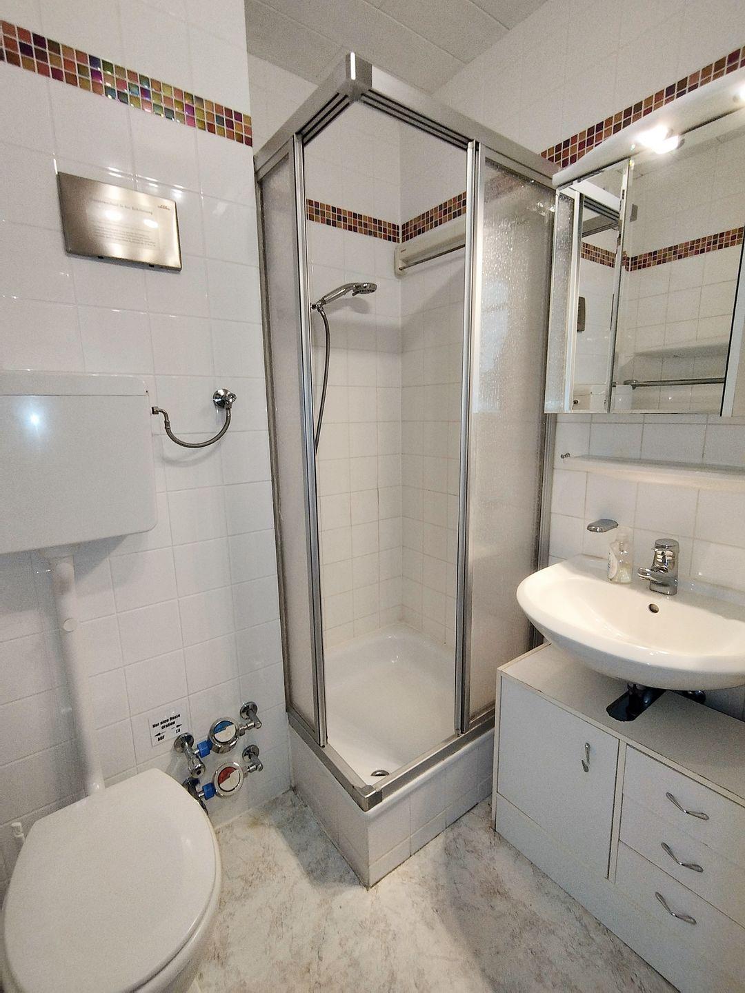 Das Badezimmer ist mit einer Duschkabine ausgestattet.