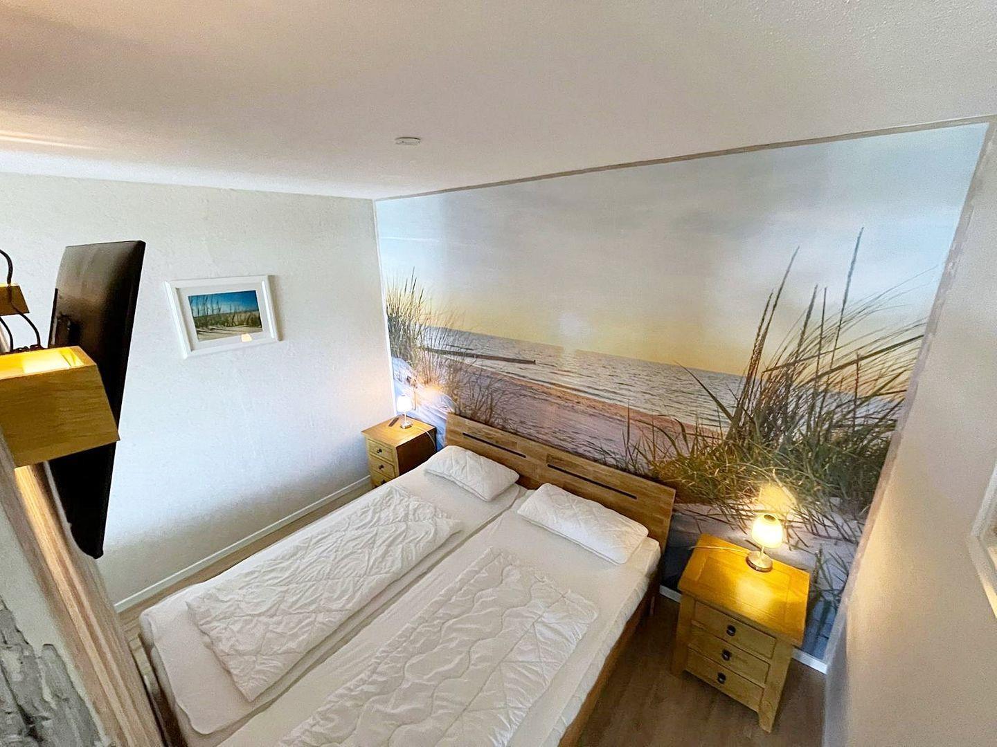 Schlafbereich mit neuem Doppelbett und durch eine Mittelwand vom Wohnbereich getrennt.