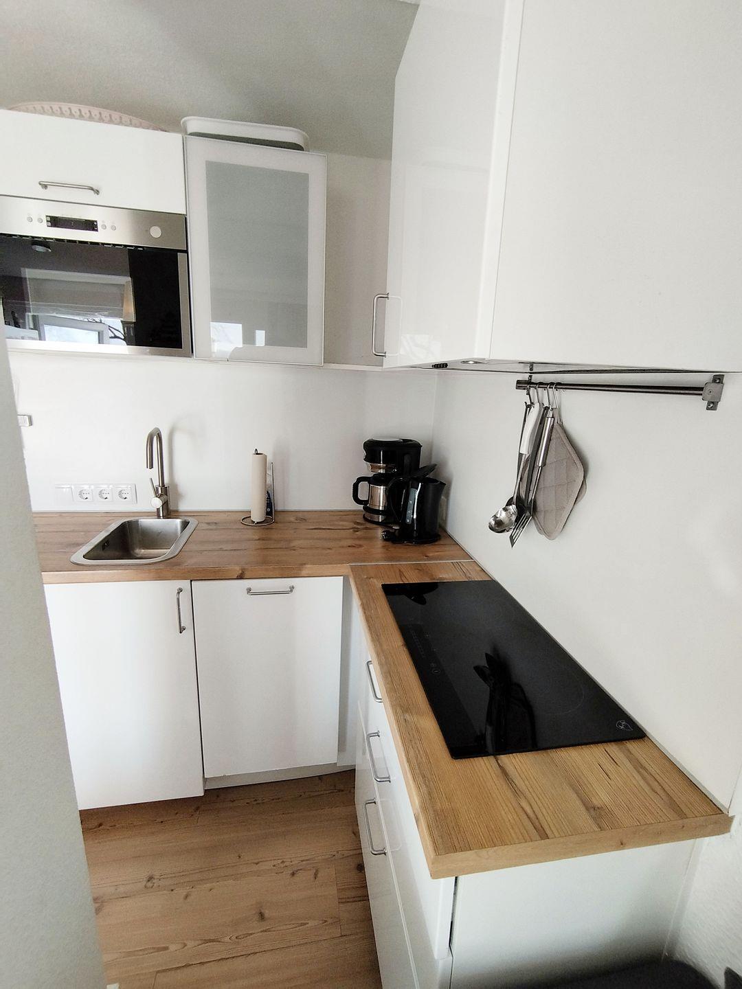 Im Anschluss finden Sie die helle, moderne L-Küche die über einen Geschirrspüler, ein 2-Feld-Ceranherd mit Dunstabzugshaube, Kühlschrank mit Tiefkühlfach und Microwelle verfügt sowie alle zum Standard gehörenden Ausstattungsmerkmale wie Toaster, Kaffeemaschine, Wasserkocher, Besteck und Geschirr und Kochutensilien.