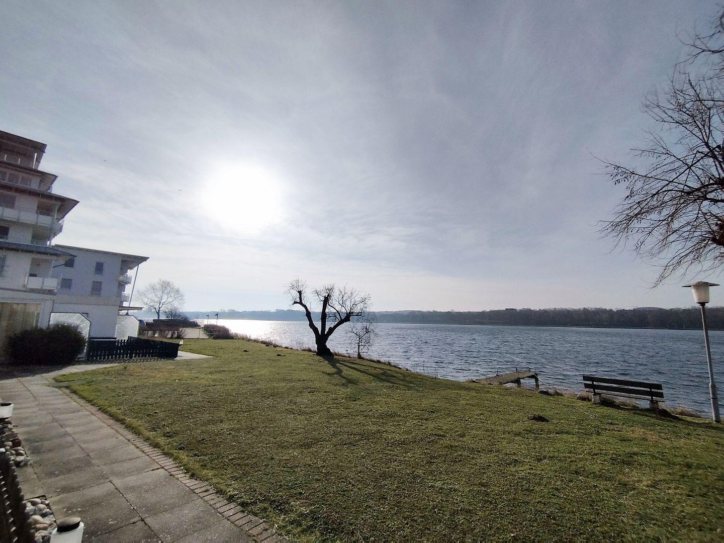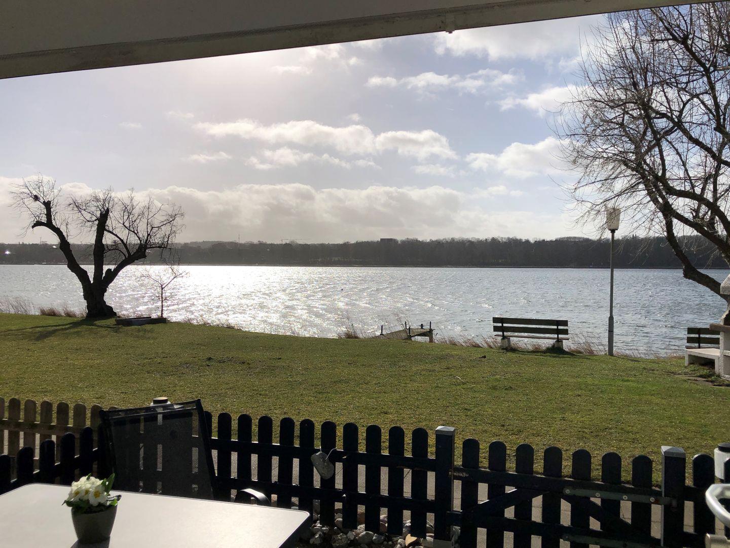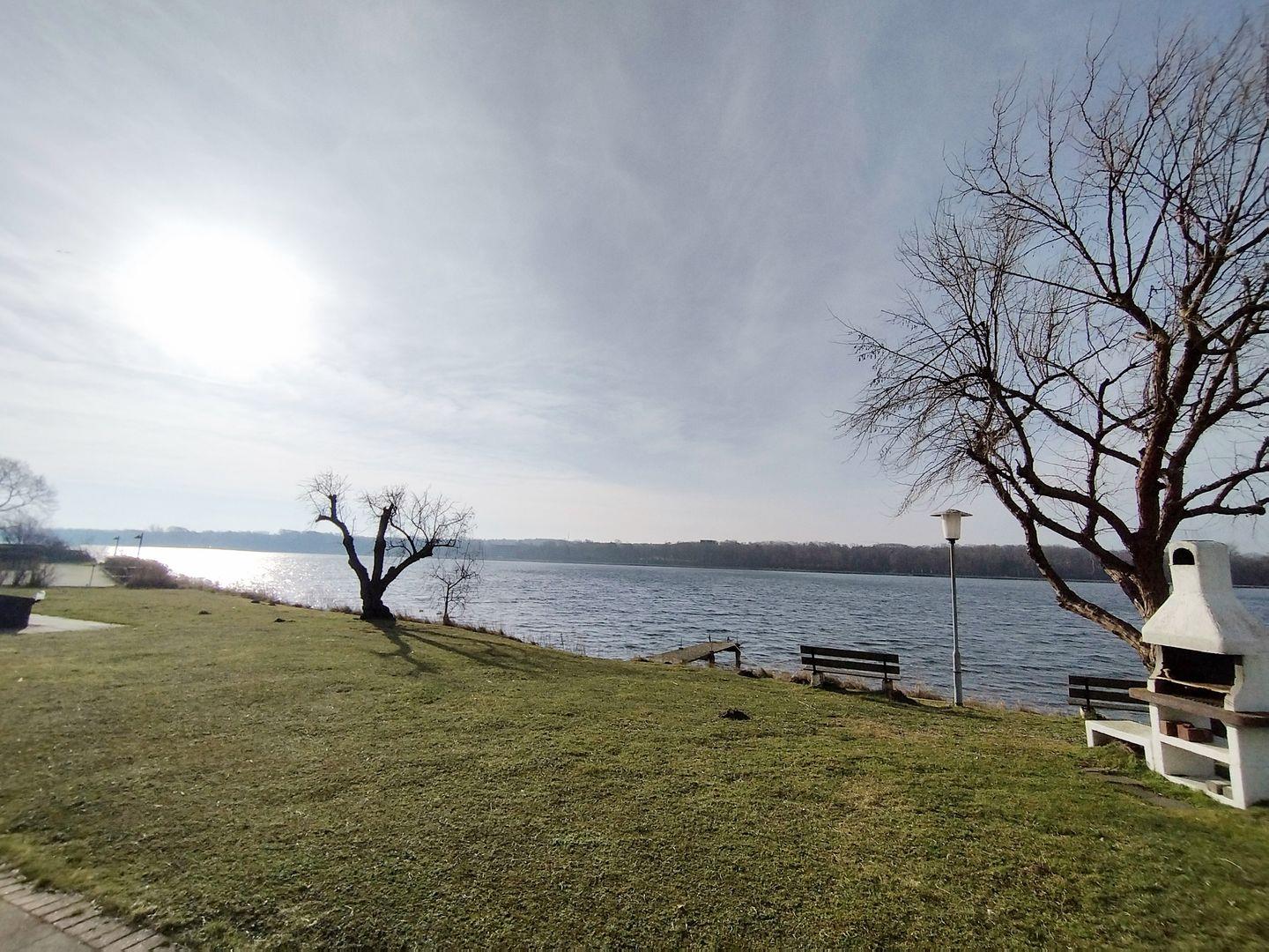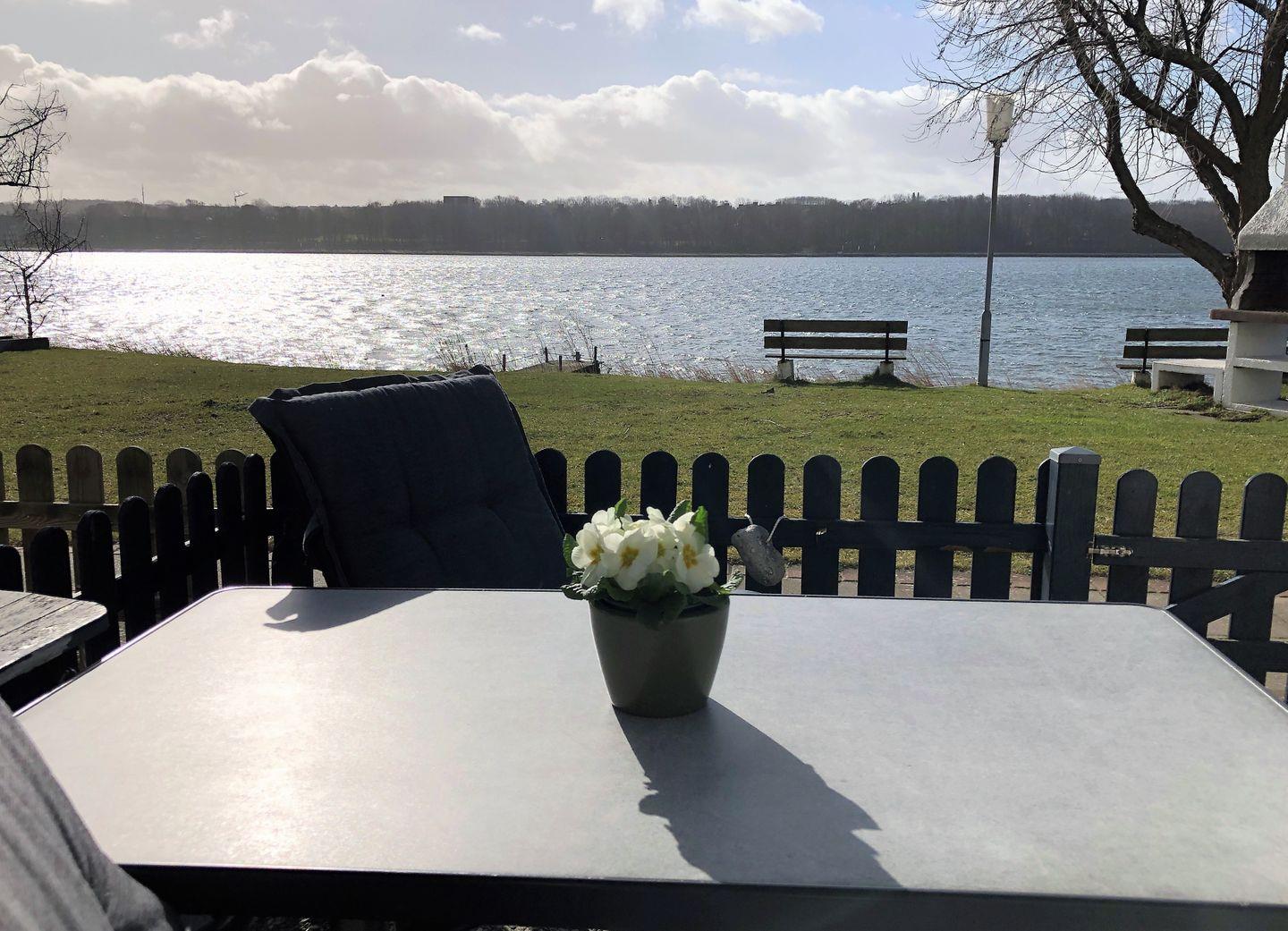 Die kuschelige Erdgeschosswohnung für zwei ist von der Rückseite des Hauses über die möblierte Terrasse zu erreichen. Hier genießen Sie aufgrund der Südlage von vormittags bis abends strahlenden Sonnenschein mit direktem Blick auf den Binnensee. Dieser liegt, nur durch eine Liege- und Spielwiese und den gemeinsam nutzbaren Grill, wenige Meter von der Terrasse entfernt.