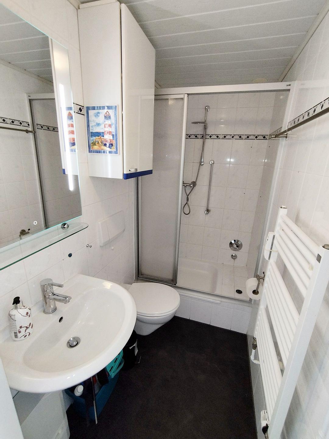 Das an der Küche angrenzende Bad bietet Ihnen eine geräumige Dusche mit fester Duschwand, Handtuchheizkörper, beleuchtetem Spiegel, Steckdose, Haartrockner und kleinen Badschrank.