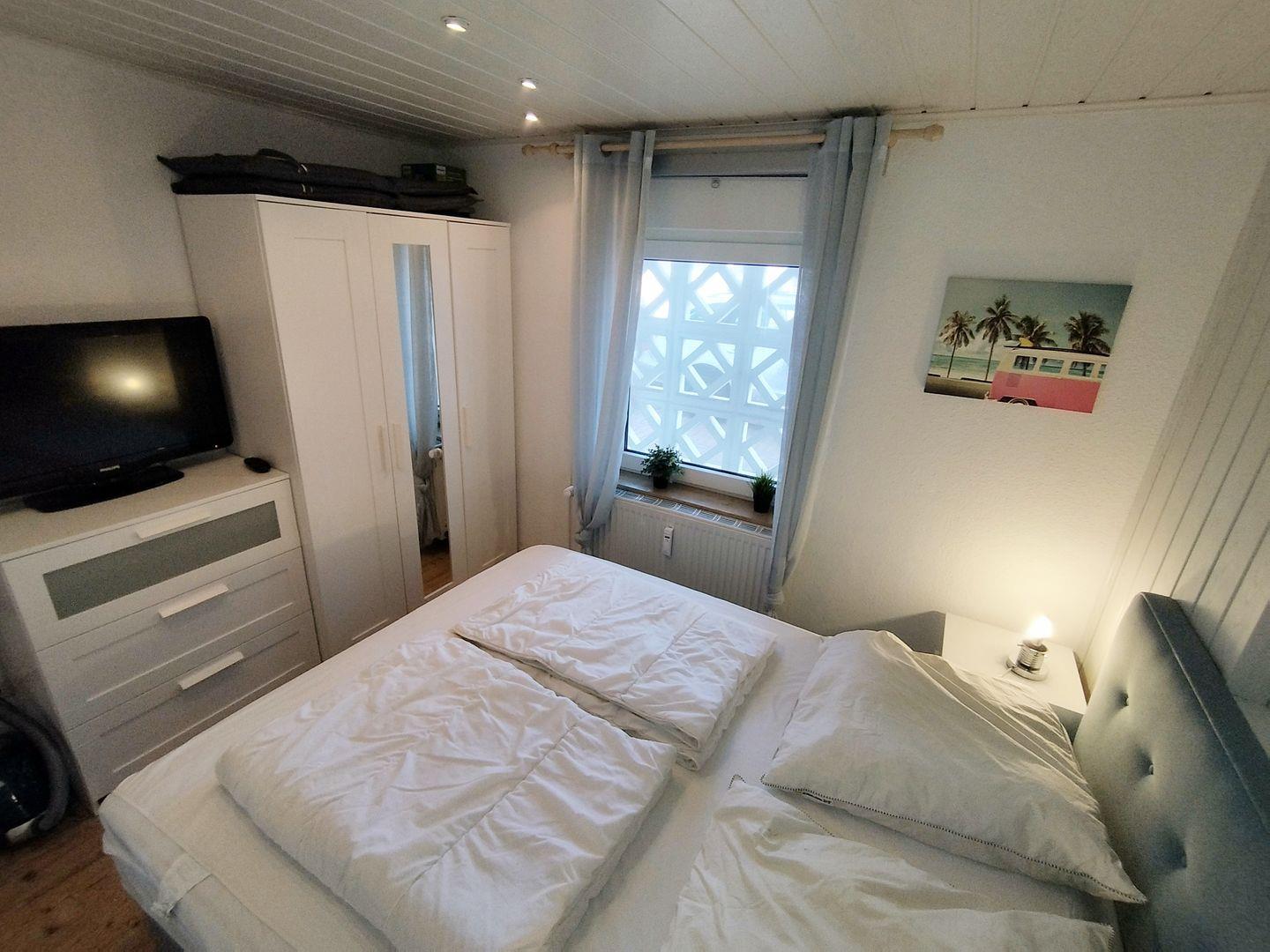 Das stylische Schlafzimmer verfügt über ein großes Fenster, einen dreitürigen Kleiderschrank mit Spiegel, eine Kommode und einen weiteren Flachbildfernseher (31“). Das 160*200 cm große, hochwertige Boxspringbett sorgt für entspannte Urlaubsnächte.