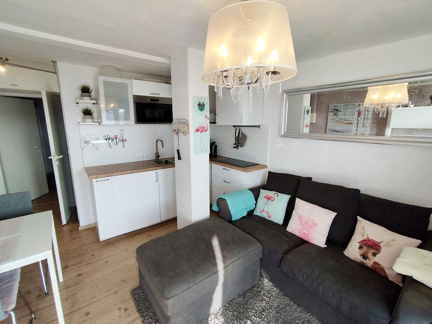 Sie betreten die liebevoll und fröhlich eingerichtete Wohnung über den Wohn- und Küchenbereich.