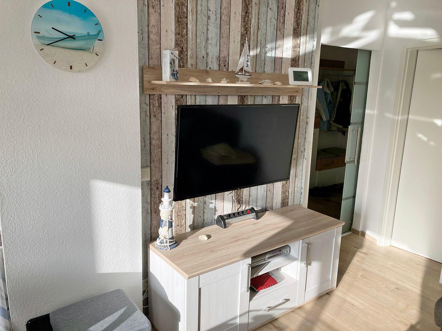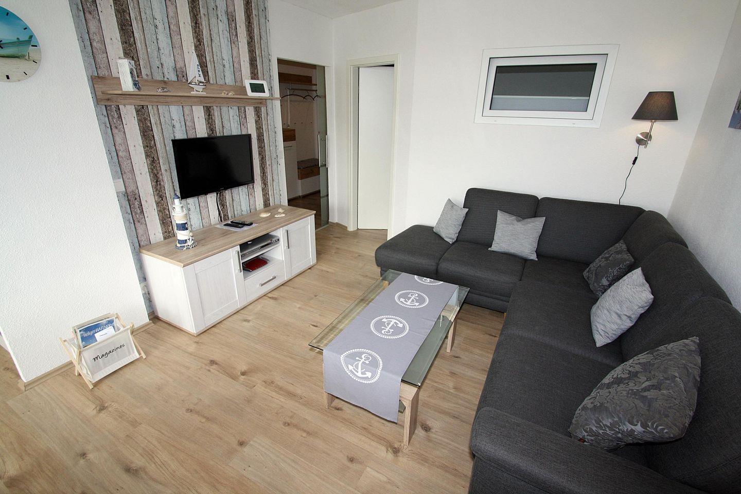 Der Wohnbereich ist mit hochwertigen und komfortablen Möbeln ausgestattet und verfügt über eine offene Küche mit Tresen sowie einem Essbereich am Fenster und einer gemütlichen Wohnlandschaft mit großem Flachbild-TV (LED-TV 123 cm). Die Couch kann als Schlafcouch genutzt werden und hierfür steht ein sep. "Topper" für den Schlafkomfort zur Verfügung.