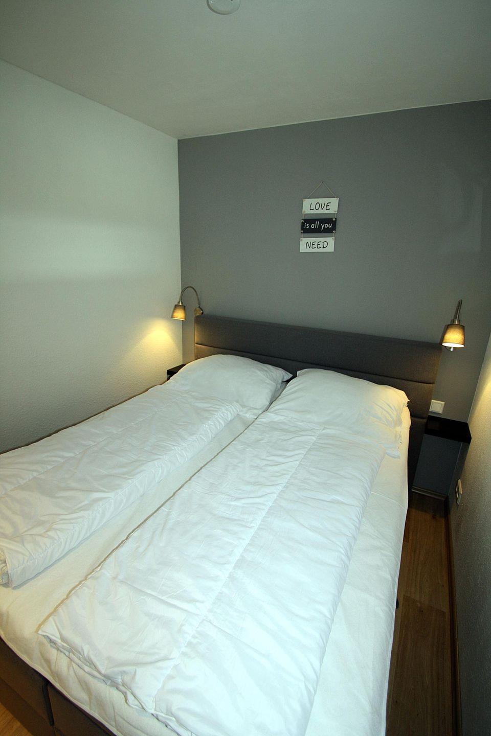 Im separaten Schlafzimmer stehen den Gästen ein Boxspringbett (160 x 200cm) sowie ein weiterer TV und ein Schrank mit Ablagefläche zur Verfügung.