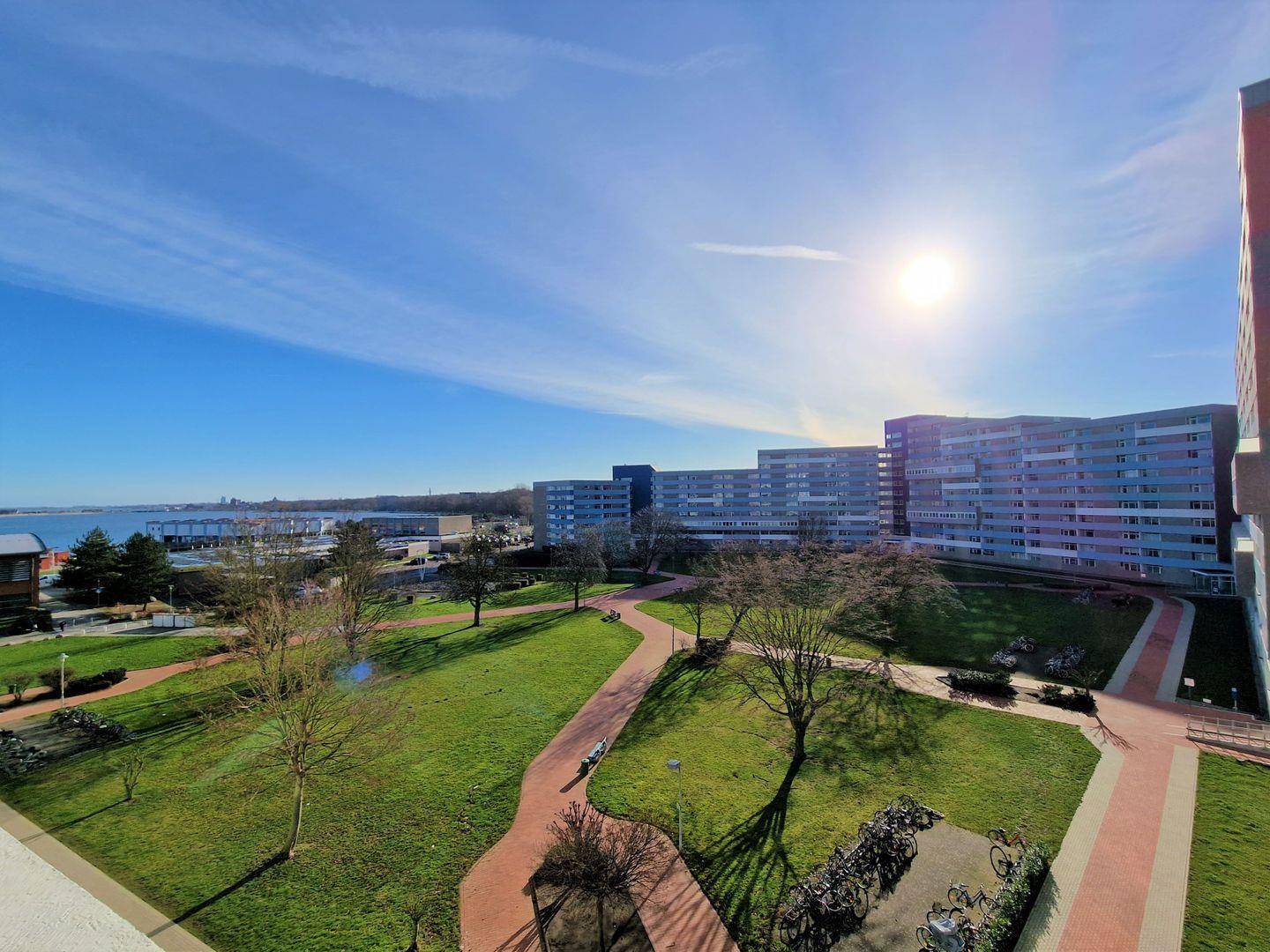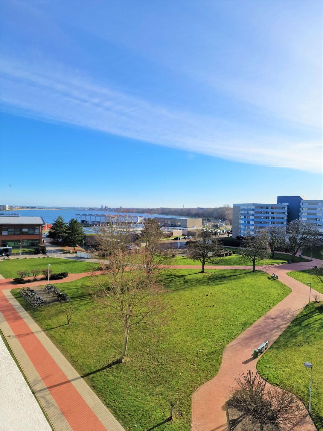 Einfache Ferienwohnung in der 5. Etage mit Balkon Südseite und Blick zum Binnensee Richtung Yachthafen.