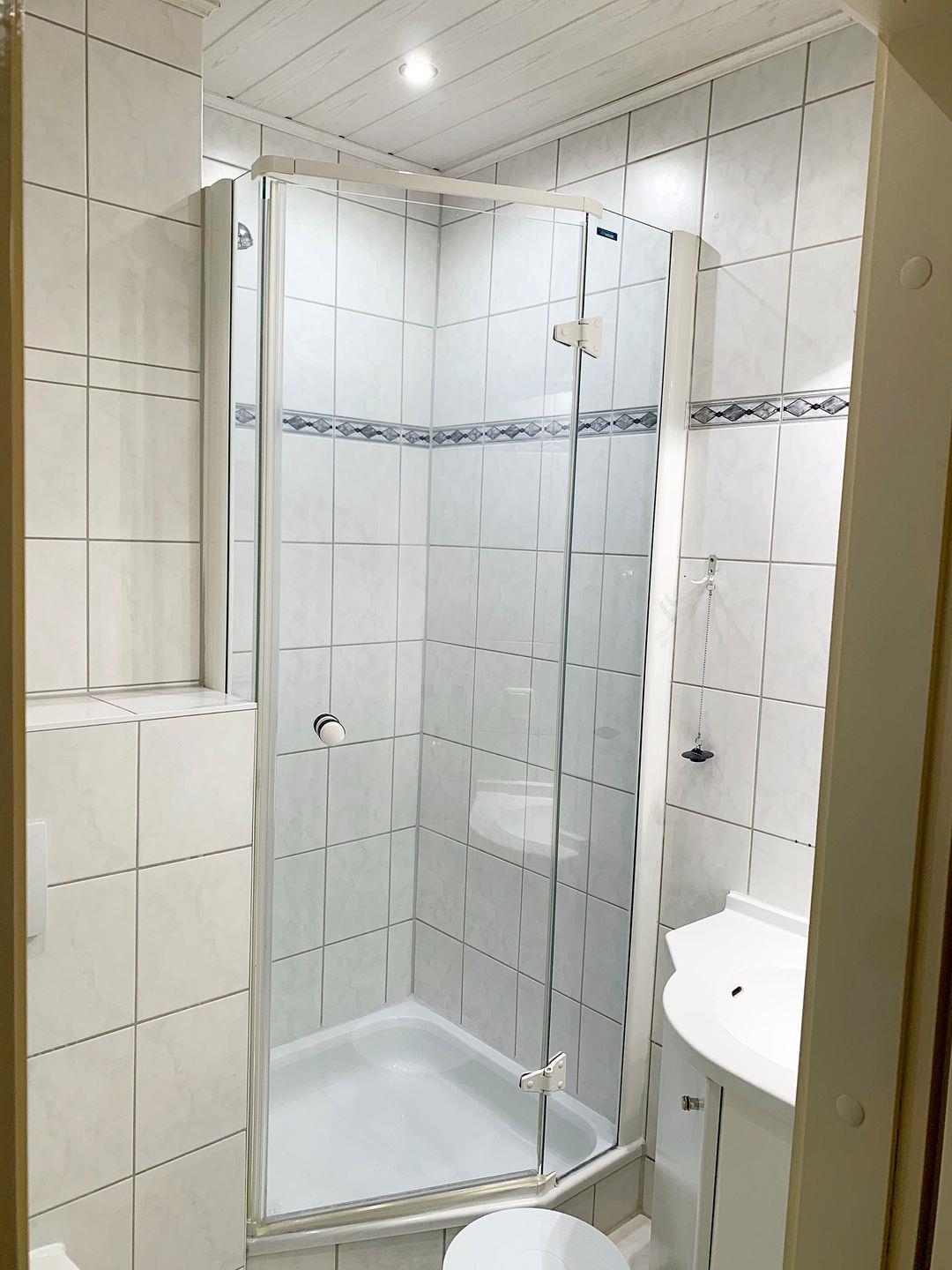 Das moderne Bad ist mit Glasduschkabine, Eckwaschtisch und WC ausgestattet.