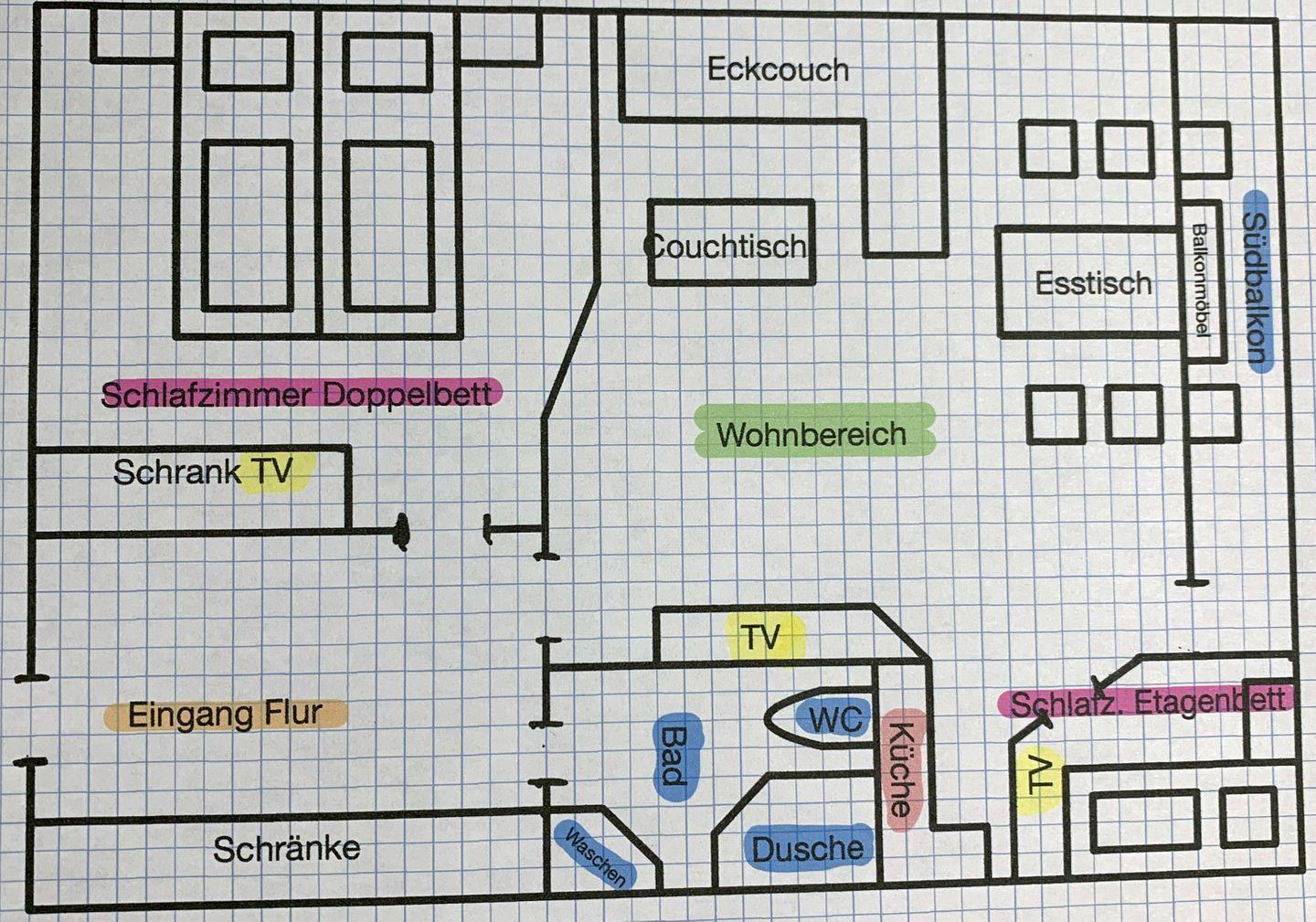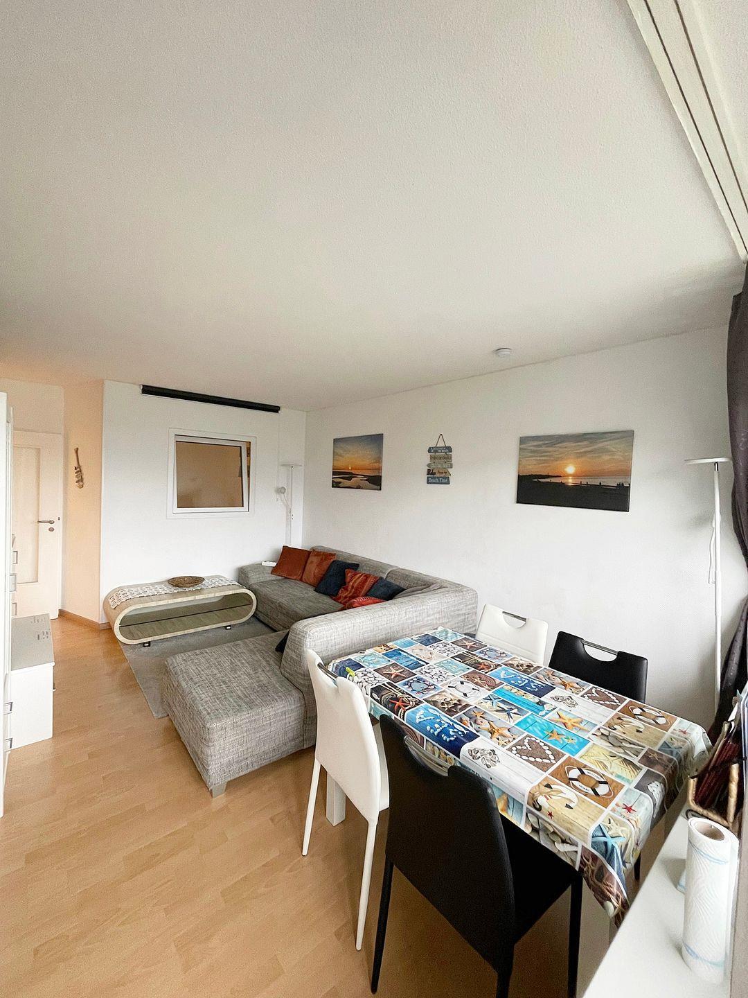 Der Wohnraum ist mit Laminat ausgestattet, verfügt über eine große Eck-Couch und einem großen Esstisch am Fenster. Des Weiteren steht ein großer 65 Zoll UHD Smart TV im Wohnbereich, der keine Wünsche offen lässt. Ein stabiles und schnelles WLAN (500 Mbit) ist inklusive.