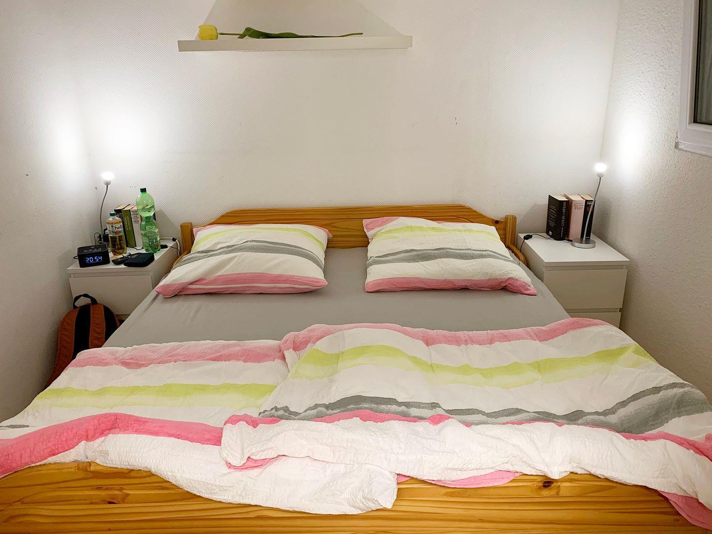 In dem frisch renovierten, großen Schlafzimmer steht ein großes Doppelbett (180x200cm, 2 getrennte Matratzen), zwei Nachttische, ein großer Kleiderschrank, sowie ein 43 Zoll Smart TV. Das große Fenster mit Verdunkelungsrollo ermöglicht einen tiefen und erholsamen Schlaf. Dieses Schlafzimmer wird durch einen separaten Zugang vom Flur erreicht.