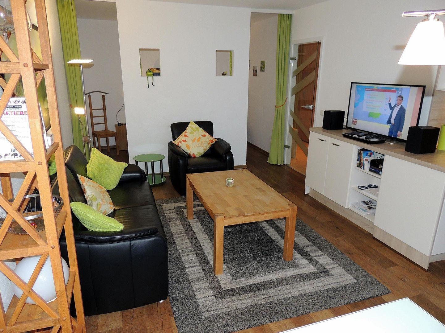 Der sehr moderne, helle -in Farbakzenten "apfelgrün", Wohnbereich, welcher sich durch die gesamte Ferienwohnng zieht, läßt Sie "als Gast" ankommen