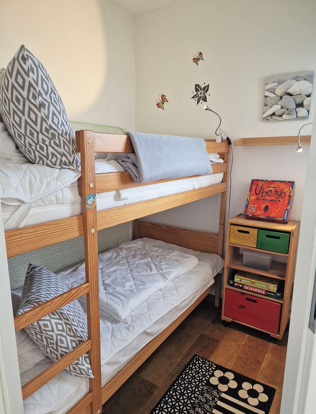 Das separate Kinderzimmer (durch eine Tür vom Wohnraum getrennt) verfügt über ein Etagenbett ( 2 x 90*90cm). Verdunklung ist vorhanden und ein Fenster zum Öffnen.