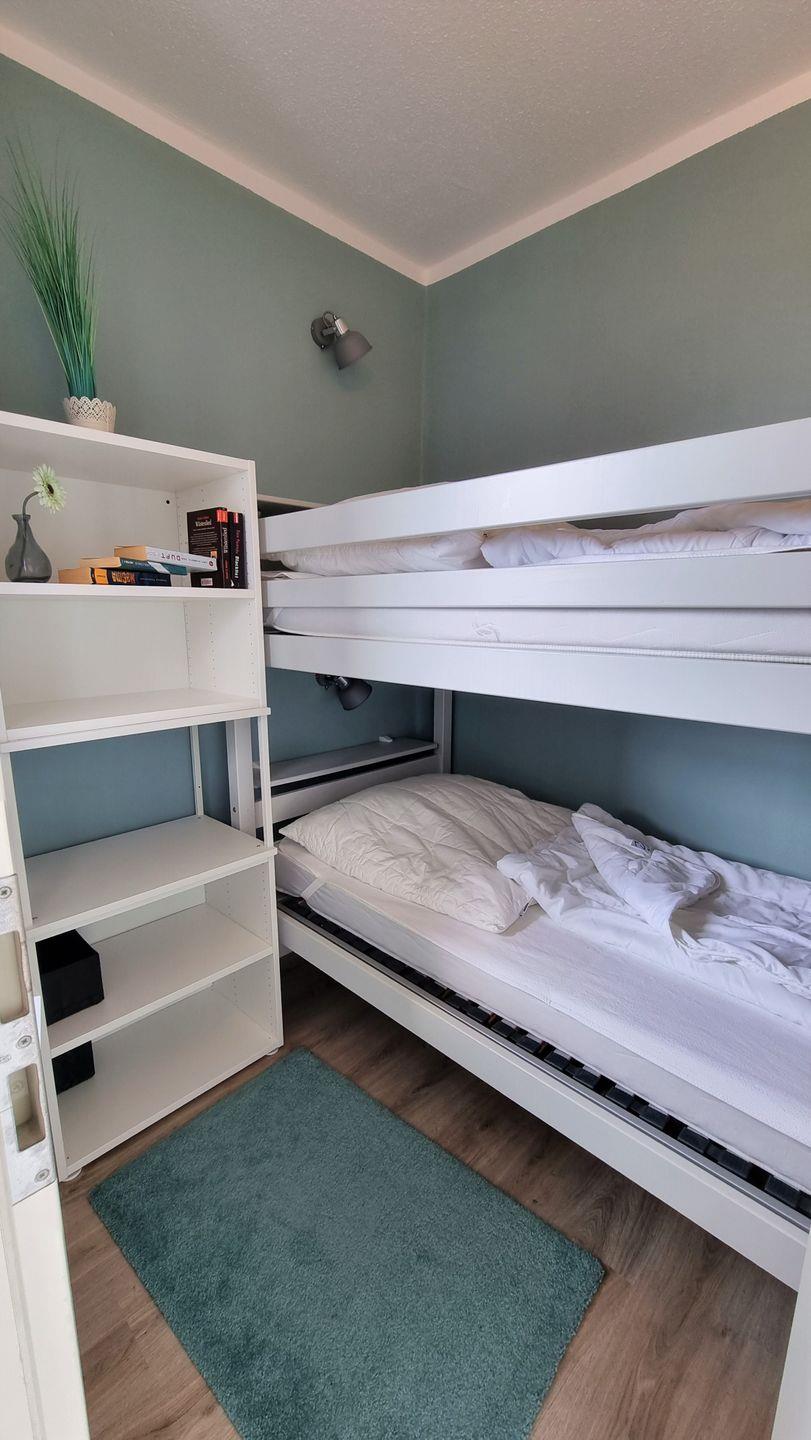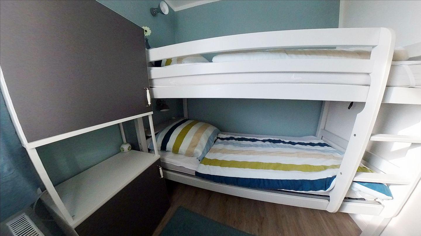 Im Kinderzimmer befindet sich ein Etagenbett (90 x 200cm) mit einem Schrank und Ablagefläche. Vor dem Fenster befindet sich ein Fliegen-/Mückengitter.